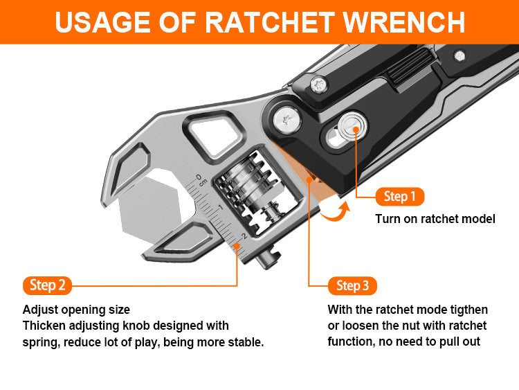 ✅ 11 essential tools embedded to get your daily task done;✅ Patented ratcheting wrench system with push button switch for user to easily toggle between standard & ratcheting modes;✅ Thicken wrench adjustable knob for firm & stable action;✅ Pliers with replaceable wire cutter blade;✅ Made of rust resistant & high strength stainless steel & aluminum;✅ Included durable nylon pouch for everyday carry. |