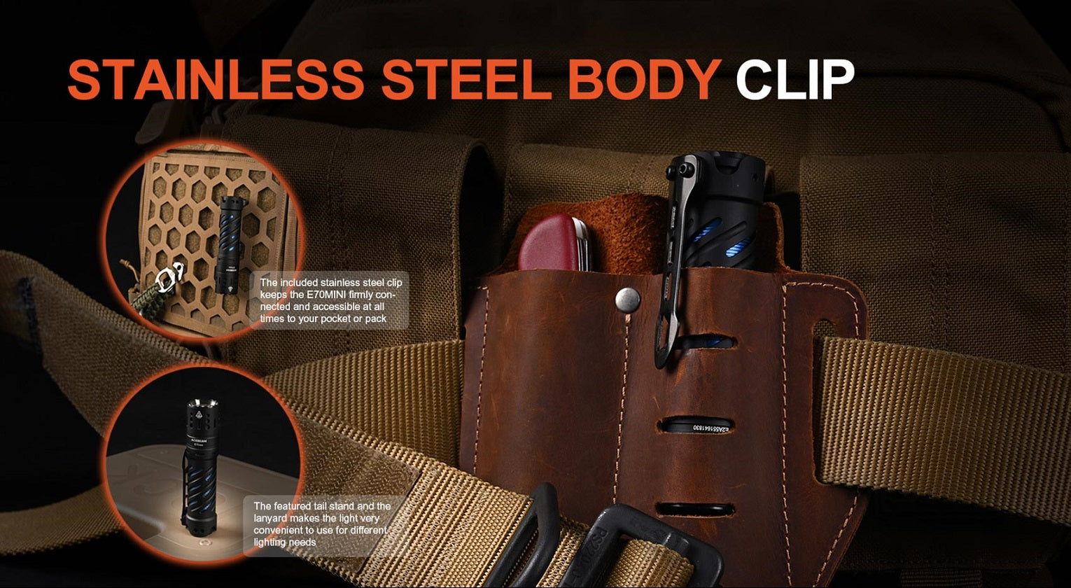 | PACKAGE OPTION : A. STANDARD PACKAGE - $99 1 x Acebeam E70 Mini LED flashlight 1 x Lanyard 1 x Pocket clip 2 x Spare o-ring 1 x Warranty card 1 x User manual