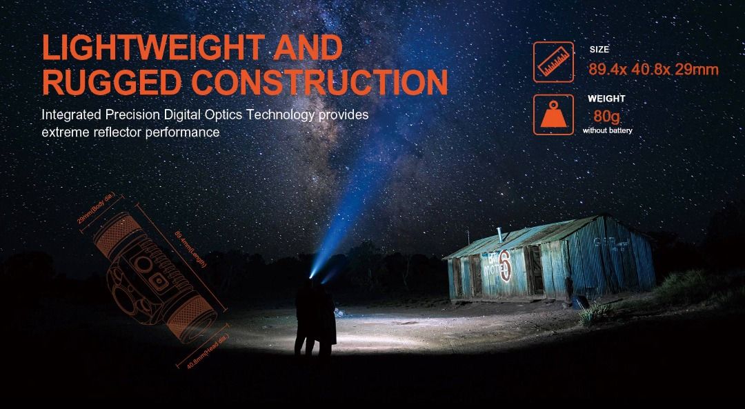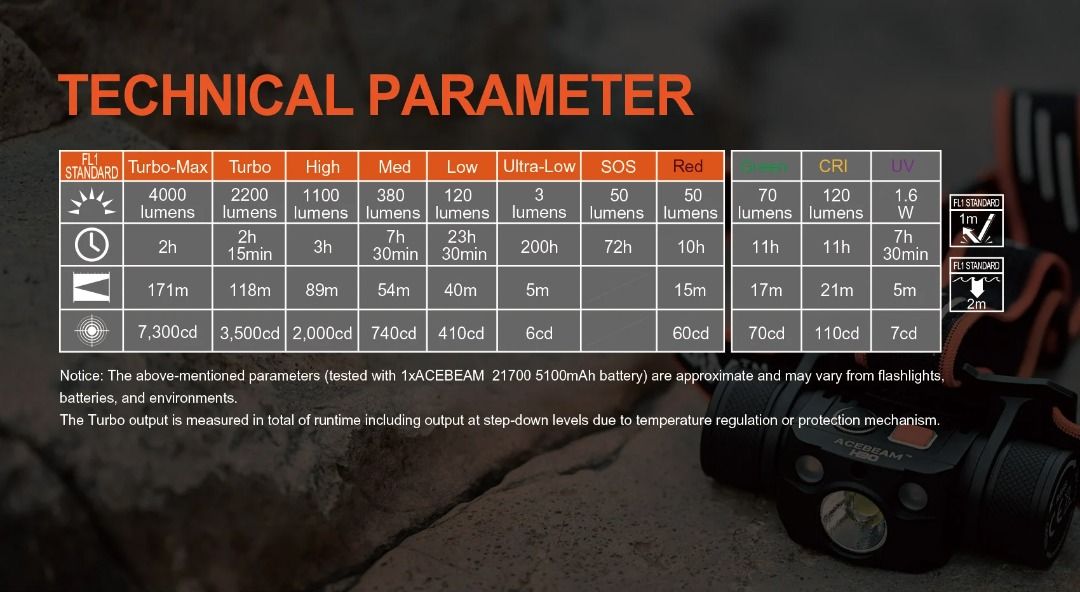 ✔ LED: i. Main : CREE XHP70.2 (6000K) ii. Side lights : 1. CREE XPE2-R2 630nm Red light & CREE XPE2-G3 530nm Green light 2. CREE XPE2-R2 630nm Red light & Nichia 276A 365nm UV 3. CREE XPE2-R2 630nm Red light & Nichia 219C CRI≥90 ✔ Mode, brightness & runtime: I. Turbo max : 4,000 lumens ~ 2 hrs II. Turbo : 2,200 ~ 2hrs 15 mins III. High : 1,100 Lumens ~ 3 Hrs IV. Mid : 380 Lumens ~ 7.5 Hrs V. Low : 120 Lumens ~ 23.5 Hrs VI. Ultralow : 3 Lumens ~ 200 Hrs ✔ Battery use : 1 x 18650 / 21700 li-ion battery ✔ Beam distance (max) : 171 meters ✔ Peak beam Intensity : 7,300cd ✔ IPX rating : IP68 ✔ Impact resistance: 2 meters ✔ Dimensions : 89.4 x 40.8 x 29 mm ✔ Weight: 151 grams |