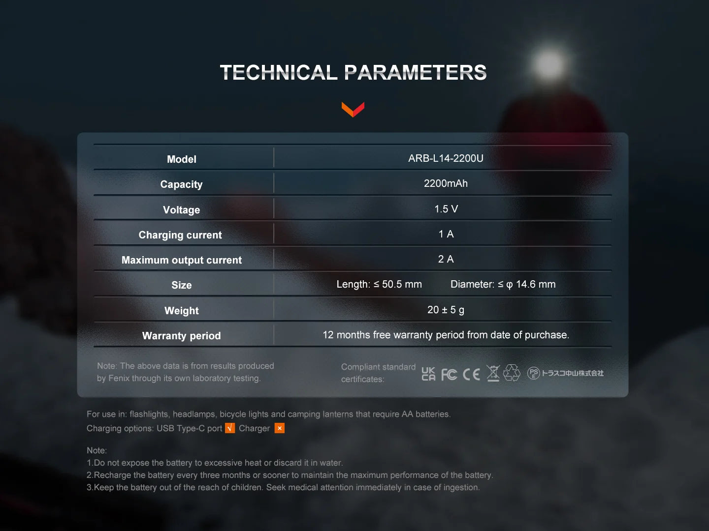 PACKAGE INCLUDE:1 x Fenix ARB-L14 2200U 1.5V AA battery |