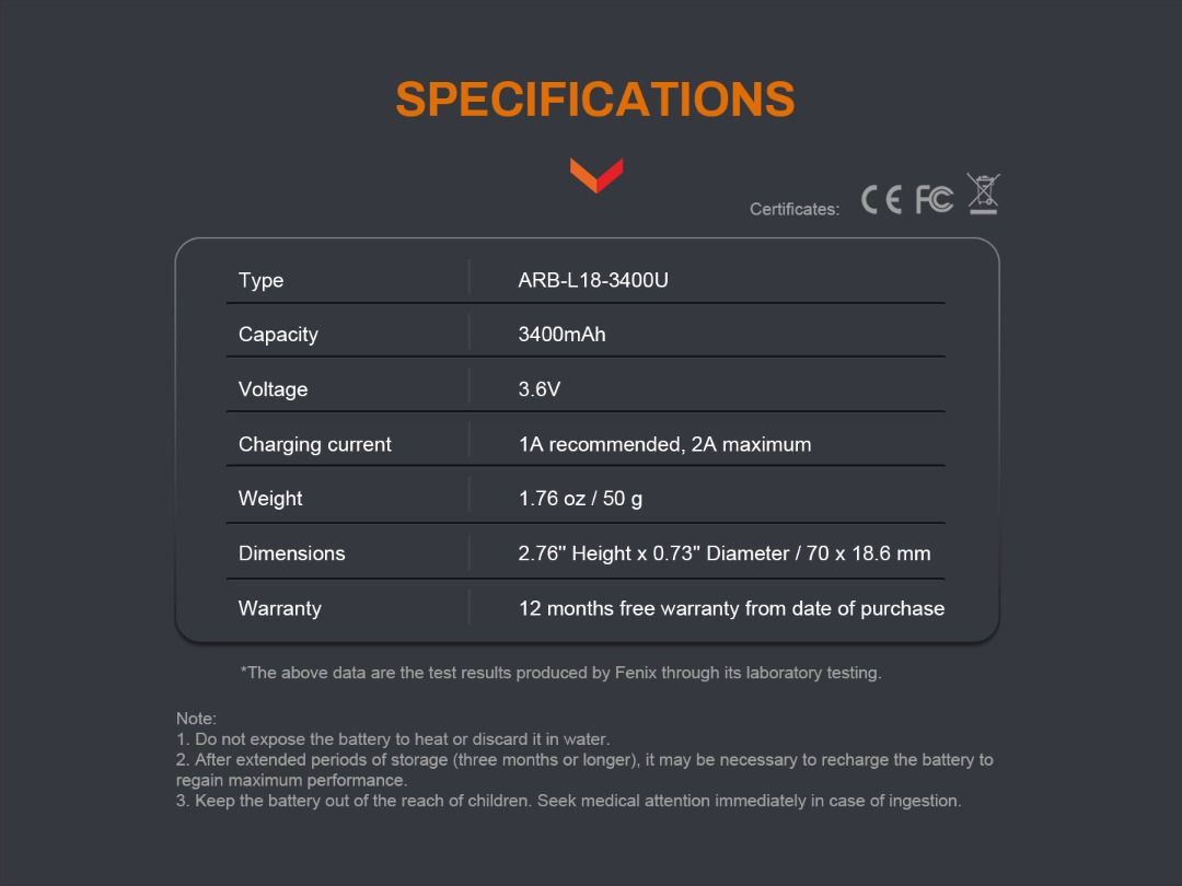 1 x Fenix 18650 Li-ion Rechargeable Battery (Model no.: ARB-L18-3400U) |