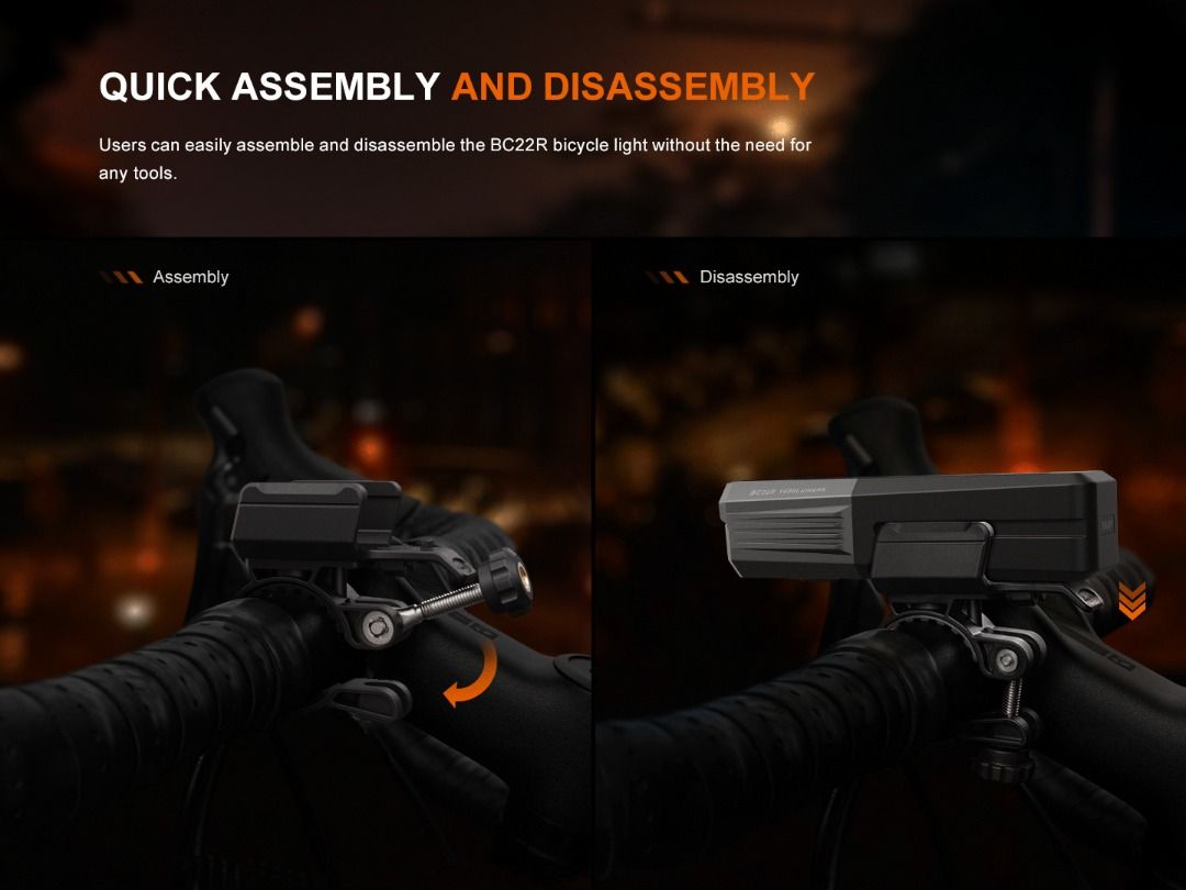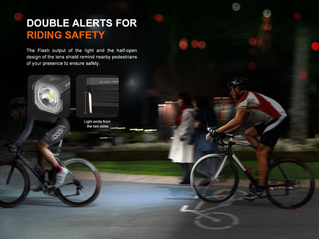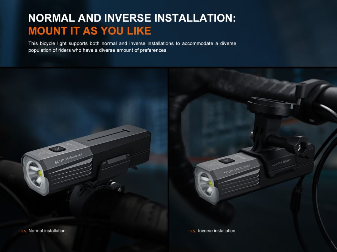 ✅ 1,400 lumens output that light up to 156 meters;✅ Support normal & inverse installation (mount included);✅ Anti-glare cut-off facula line prevents the light from dazzling oncoming pedestrians & vehicle drivers;✅ 5 modes to meet different environment lighting needs;✅ USB-C charging port on body for fast & convenient charging;✅ Powered by self-replaceable 18650 li-ion battery;✅ Easy to read battery level indicator on switch;✅ Fenix quick release mounting system for instant removable & installation;✅ Tough metal case to ensure better durability;✅ IP68 Waterproof & shockproof. |