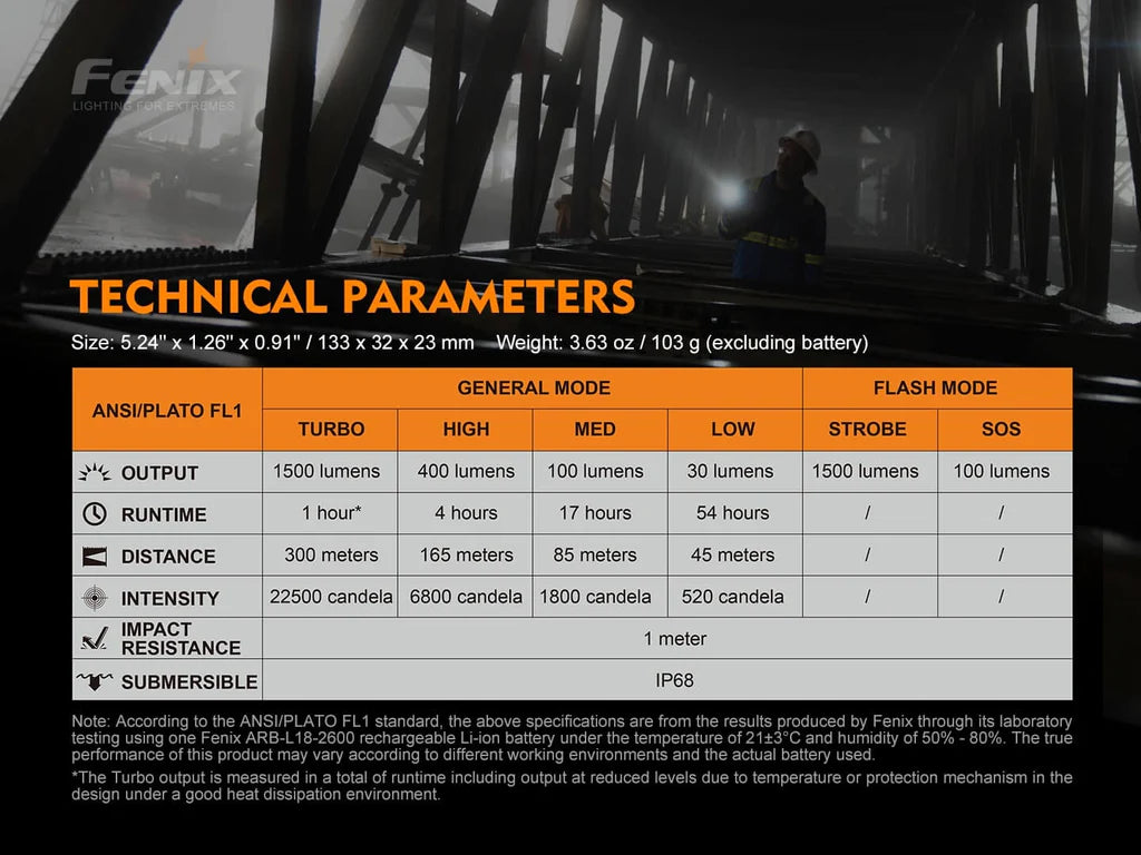 • LED : 1 x Cool white LED• Mode, brightness & runtime :I. Turbo : 1,500 lumens I 1 hrII. High : 400 lumens I 4 hrsIII. Med : 100 lumens I 17 hrsIV. Low : 30 lumens I 54 hrsV. Strobe : 1,500 lumens I -VI. SOS : 100 lumens I -• Beam distance (max) : 300 meters• Beam intensity (max) : 22,500 candela• Battery use : 1 x 18650 li-ion battery• Impact resistance : 1 meters• Weight : 103 grams (exclude battery)• Measurement : 133 x 32 x 23 mm• Waterproof rating : IP68 |