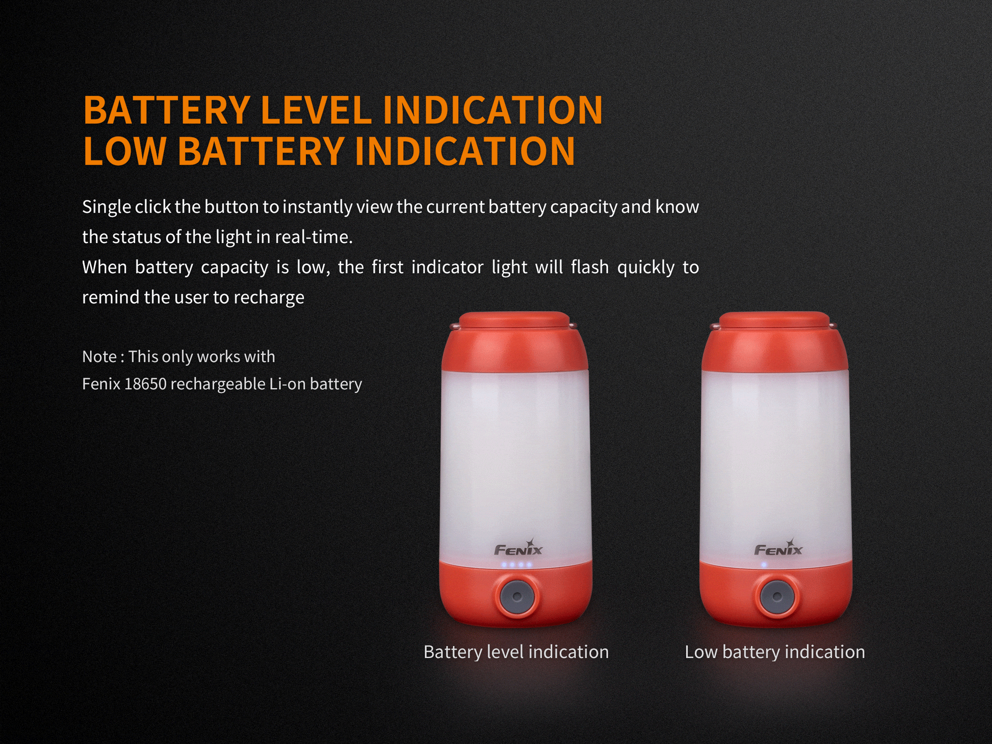PACKAGE INCLUDE : 1 x Fenix CL26R lantern 1 x Fenix 18650 Li-ion rechargeable battery_2600 mAh 1 x Micro USB charging cable 1 x Keychain 1 x Spare o-ring 1 x User manual 1 x Warranty card |