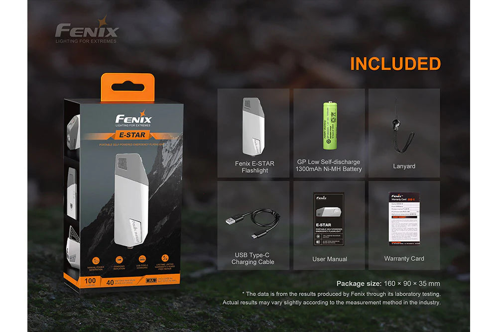 1 x Fenix E-Star flashlight1 x AA rechargeable battery1 x Lanyard1 x USB-C charging port1 x User manual1 x Warranty card |