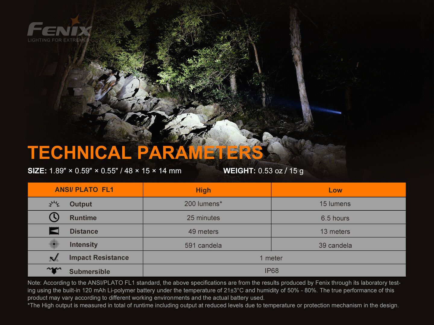 ✔ LED : 1 x Cree XP-G2 S3 white ✔ Mode, brightness & runtime : I. High : 200 lumens / 25 mins II. Low : 15 lumens / 6.5 hrs ✔ Beam distance (max) : 49 meters ✔ Beam distance (intensity) : 591 cd ✔ Battery use : Built-in 120 mAh li-polymer battery ✔ Impact resistance : 1 meter ✔ Waterproof rating : IP68 ✔Weight : 15 grams ✔ Measurement : 48 x 15 x 14 mm |