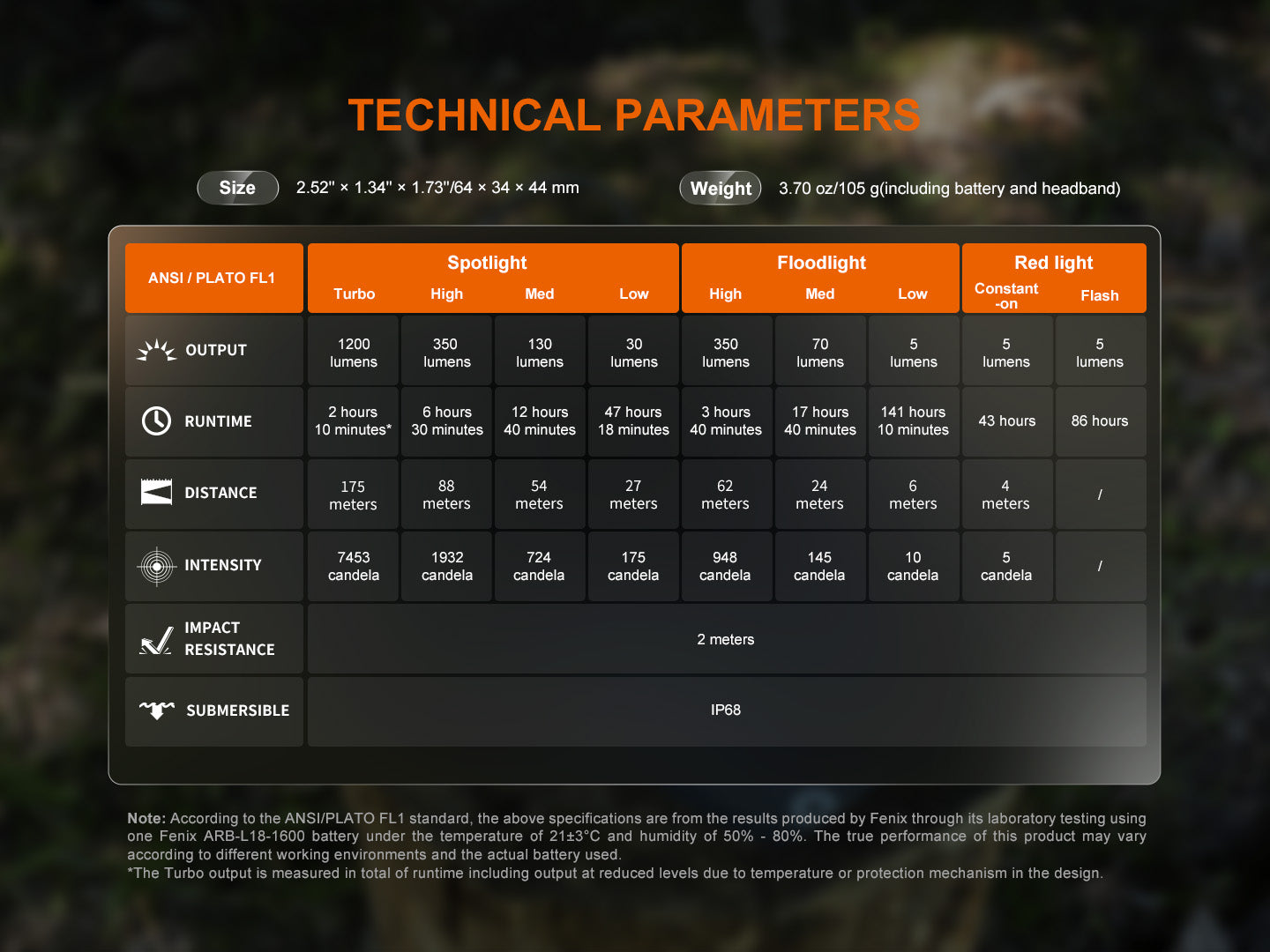 SPECIFICATIONS: ✔ LED :I. Spotlight : 1 x Luminus SST25 (white - 6500K)II. Floodlight : 1 x Luminus SST20V-Ra90 (neutral white - 5000K)III. Red light : 1 x 2835 red✔ Output, runtime & beam distance:I. Spotlight mode (white light):A. Turbo : 1,200 lumens I 2 hrs 10 mins I 175 metersB. High : 350 lumens I 6 hrs 30 mins I 88 metersC. Med: 130 lumens I 12 hours 40 mins I 54 metersD. Low : 30 lumens I 47 hrs 18 mins I 27 metersII. Floodlight mode (neutral white light):A. High : 350 lumens I 3 hrs 40 mins I 62 metersB. Med : 70 lumens I 17 hrs 40 mins l 24 metersC. Low : 5 lumens l 141 hrs 10 mins l 6 meters✔ Beam distance (max) : 175 meters✔ Beam intensity (max) : 7,453 cd✔ Power source : 1 x 18350 or 16340 or CR123A li-ion battery✔ Impact resistance : 2 meters✔ Waterproof rating : IP68 (submersible 2 meters)✔ Dimensions : 64 x 34 x 44 mm✔ Weight : 105 grams with battery |