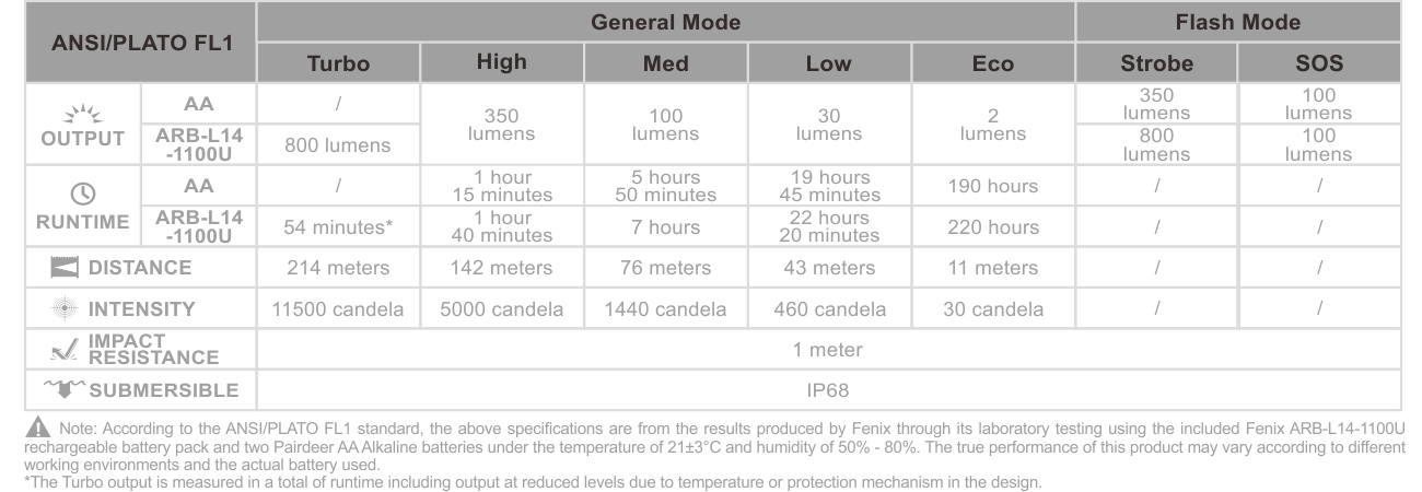 ✔ Brightness level / runtime (with Fenix battery):I. Turbo : 800 lumens / 54 minutesII. High : 350 lumens / 1 hour 40 minsIII. Medium : 100 lumens / 7 hoursIV. Low : 30 lumens / 22 hours 20 minsV. Eco : 2 lumens / 220 hoursVI. Strobe : 800 lumens / -VII. SOS : 800 lumens / -✔ Peak beam distance : 214 meters✔ Peak beam intensity : 11,500cd✔ Battery use : 2 x AA / 1 x Fenix li-ion battery✔ Impact resistance : 1 meter✔ Waterproof : IP68 (2 meters submersible)✔ Dimensions : 148 x 21.5 x 18 mm✔ Weight : 96 grams including battery |