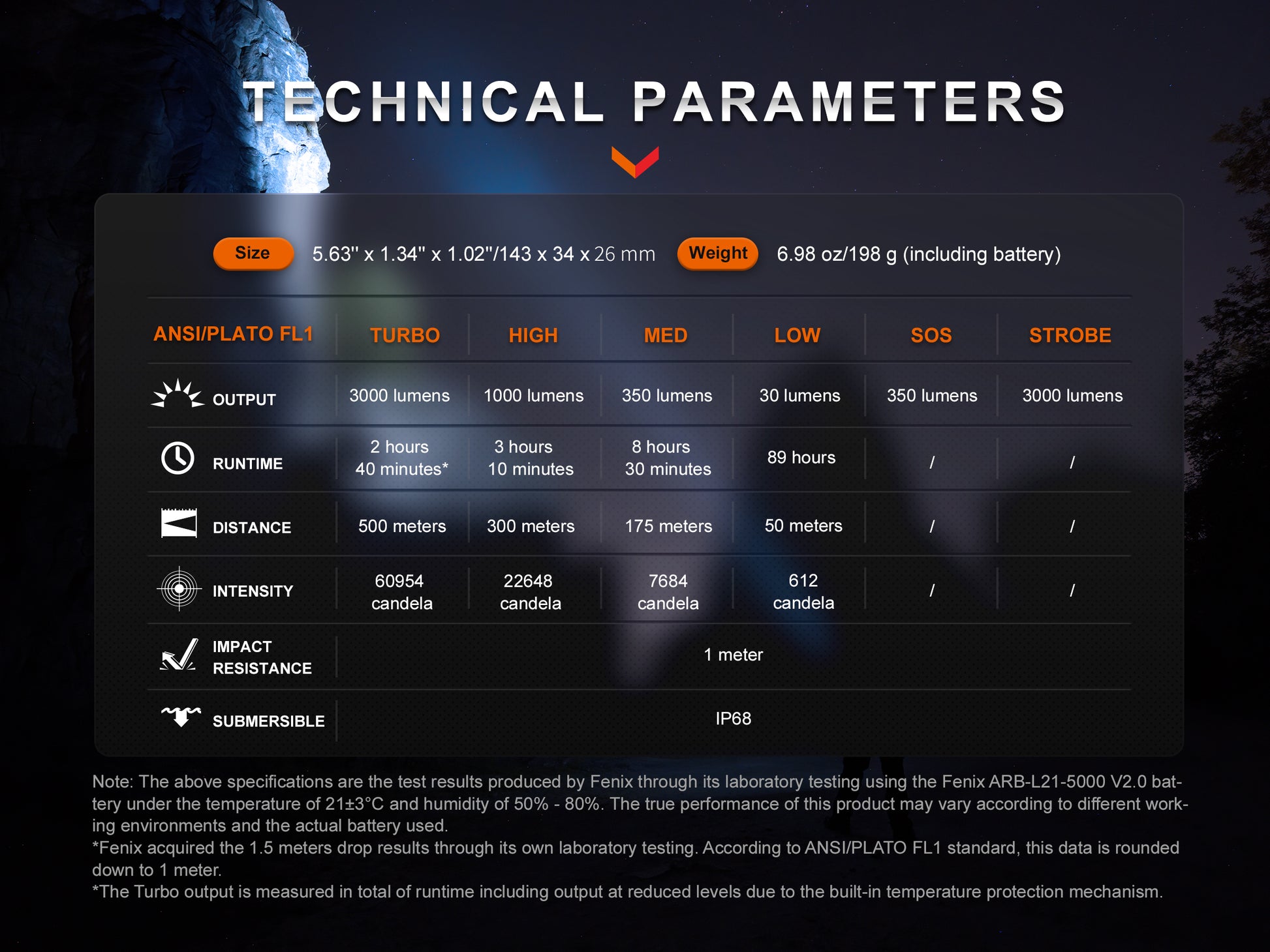 ✔ LED : 1 x Luminus SFT70 LED (6500K)✔ Mode, brightness & runtime :I. Turbo : 3,000 lumens I 2 hrs 40 minsII. High : 1,000 lumens I 3 hrs 10 minsIII. Med : 350 lumens I 8 hrs 30 minsIV. Low : 30 lumens I 89 hrsV. Strobe : 2,500 lumens I -VI. SOS : 350 lumens I -✔ Peak beam distance : 500 meters✔ Peak beam intensity : 60,954 candela✔ Impact resistance : 1 meter✔ Waterproof rating : IP68 (2 meters submersible)✔ Measurement : 143 x 34 x 26 mm✔ Weight : 198 grams |