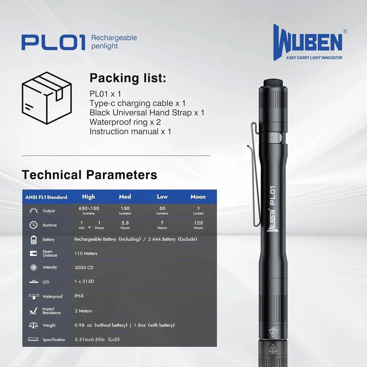 1 x Wuben PL01 penlight1 x Wuben 10880 li-ion rechargeable battery_600 mAh1 x USB-C charging cable1 x Lanyard2 x Spare o-ring1 x User Manual |