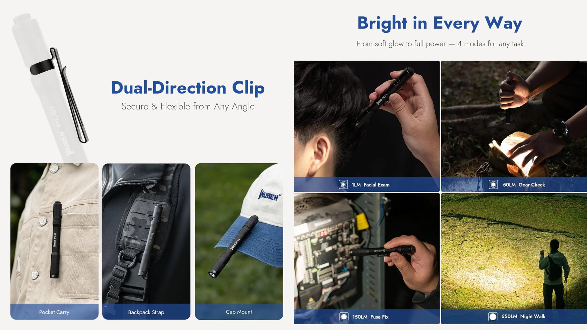 ✅ 650 lumens max output shine up to 110 meters;✅ Mode memory function for quick access to preferred mode;✅ USB-C charging port on battery for convenient & quick re-charging;✅ Powered by the included battery or 2 x AAA battery;✅ Dual position pocket clip for more carry options;✅ Simple & straight-forward tail switch design for accessing all the lighting modes;✅ Multiple protections : battery overcharge, battery over-discharge, battery reverse polarity & overheat protections;✅ Streamline, compact & slim design, perfect for daily carry;✅ Made of durable & lightweight aluminum alloy;✅ Waterproof & shockproof. |