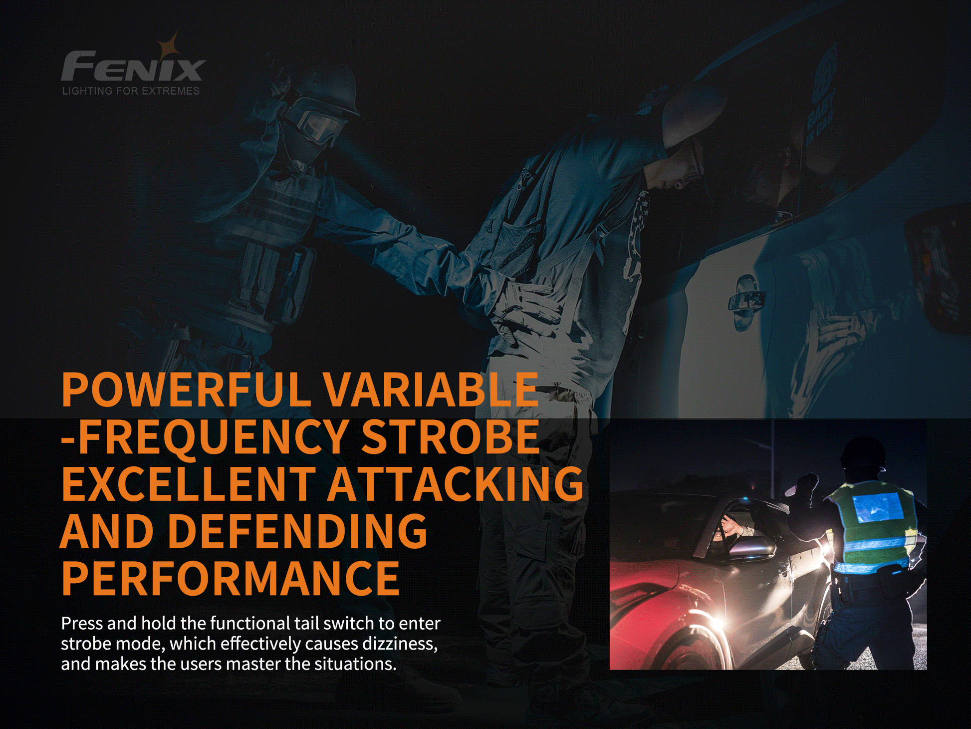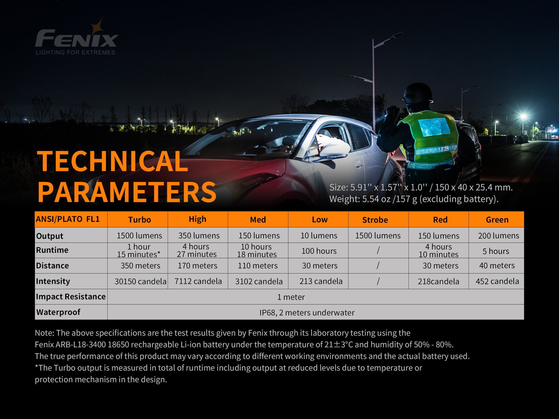 ✔ LED : CREE XP-E2 and LUMINUS SST40✔ Mode, brightness & runtime :I. Turbo: 1500 lumens / 1 hour 25 minutesII. High: 350 lumens / 4 hours 40 minutesIII. Medium: 150 lumens / 10 hours 50 minutesIV. Low: 10 lumens / 100 hoursV. Strobe: 1500 lumens / -VI. Red: 150 lumens / 4 hours 20 minutesVII. Green: 200 lumens / 5 hours 10 minutes✔ Beam distance (max) : 350 meters✔ Beam intensity (max) : 30,150 cd✔ Power source : 1 x 18650 or 2 x CR123A batteries✔ Impact resistance: 1 meter✔ Waterproof rating : IP68 (2 meters submersible)✔ Dimensions : 150 x 40 x 25.4 mm✔ Weight : 157 grams (excluding battery) |