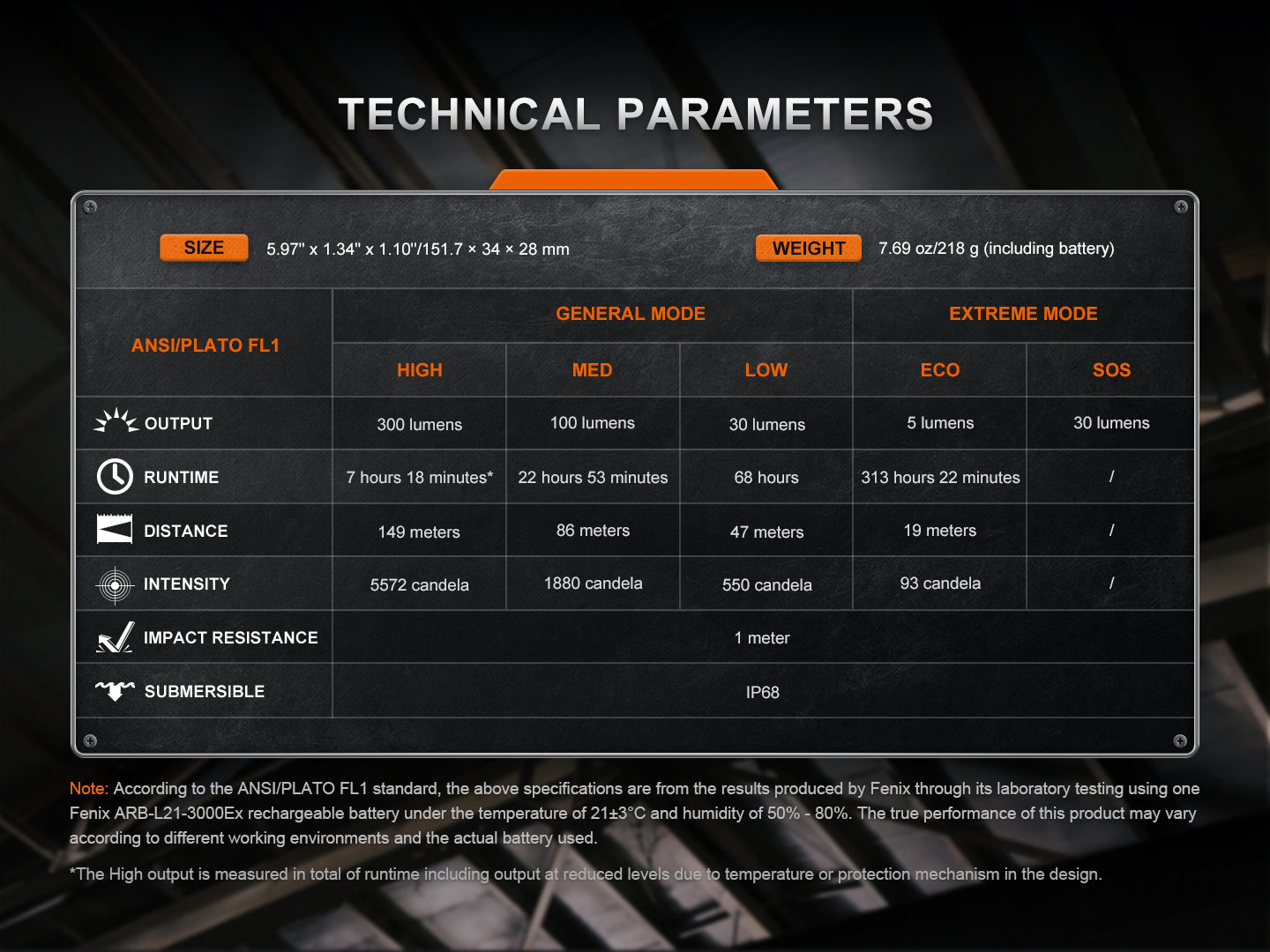 << SPECIFICATIONS >> ✔ LED : 1 x Cree XP-G3 LED ✔ Mode, brightness & runtime : I. High : 300 lumens I 7 hrs 18 mins II. Med : 100 lumens I 22 hrs 53 mins III. Low : 30 lumens I 68 hrs IV. ECO : 5 lumens I 313 hrs 22 mins V. SOS : 30 lumens I - ✔ Beam distance (max) : 149 meters ✔ Beam intensity (max) : 5,572 candela ✔ Battery use : 1 x Explosion proof 21700 battery ✔ Impact resistance : 1 meter ✔ Waterproof rating : IP68 ✔ Weight : 218 grams ✔ Dimension : 151.7 x 34 x 28 mm |