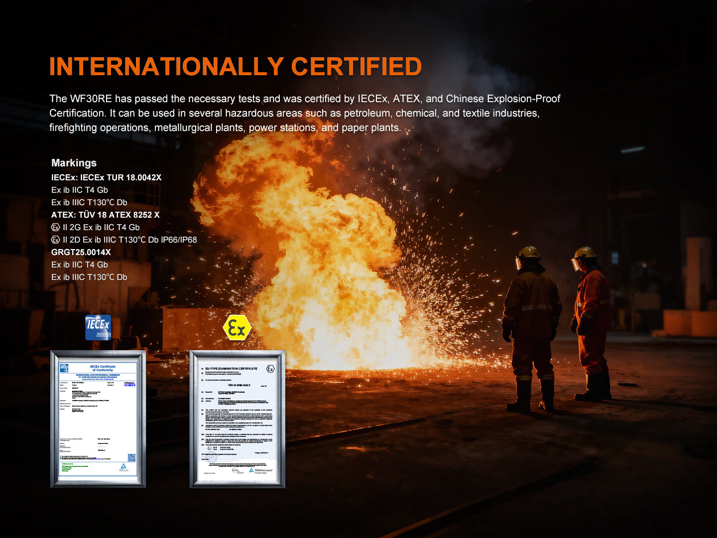 << KEY FEATURES >> ✅ 300 lumens max output illuminate up to 149 meters; ✅ Intrinsically safe flashlight for use in hazardous areas; ✅ Internationally certified by IECEx, ATEX and GRGT; ✅ Can be safely used potentially explosive gas & dust atmospheres (Zone 1, 2, 21 & 22); ✅ Suitable for multiple industries such as petroleum, chemical, textile, fire controlling, metallurgical areas, power stations & paper plant; ✅ 313 hours long time on ECO mode for uninterrupted light plus SOS for signaling in emergency situation ; ✅ Powered by single explosion proof 21700 rechargeable battery; ✅ Made of high strength & lightweight aluminum alloy; ✅ Convertible into headlamp with optional Fenix ALD-05 safety helmet headband; ✅ IP68 rated protection & passed 1 meter impact test. |