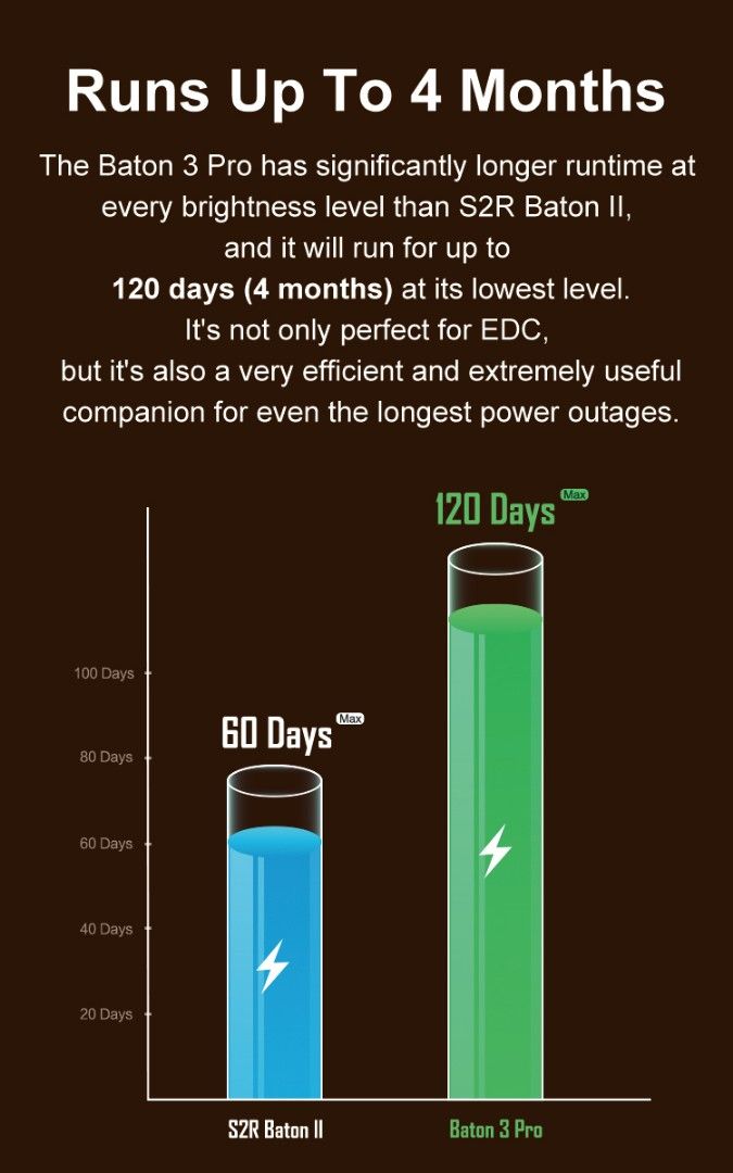 ✔ LED: 1 x High performance cool white LED ✔ Mode, brightness & runtime : I. Turbo : 1,500 ➤ 600 lumens / 2+ 🡆 177 mins II. High : 600 ➤ 120 lumens / 180 🡆 25 mins III. Mid : 120 Lumens / 17 hrs IV. Low : 15 Lumens / 100 hrs V. Moonlight : 0.5 Lumens / 120 days VI. Strobe : 650 lumens / - ✔ Battery use : 1 x Customised 18650 li-ion battery (Included) ✔ Beam distance (max) : 175 meters ✔ Beam intensity (max) : 7,900 cd ✔ Waterproof rating : IPX8 ✔ Impact resistance : 1.5 meters ✔ Dimensions (mm) : 101.4 x 23 ✔ Weight : 103 grams |