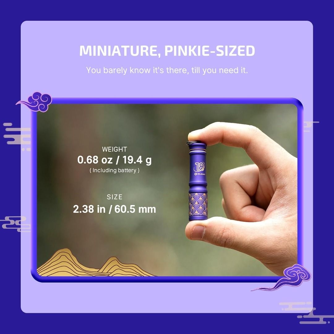✅ Olight's 18th anniversary edition in unique style;✅ Pinky finger size & lightweight, perfect for everyday carry in pocket & pouch;✅ Simple operation, fully tighten the head to turn & loosen it to turn off;✅ Powered by widely available AAA battery;✅ Included keychain for convenient attach to keychain or carabiner;✅ Made of durable aluminum with high scratch resistant anodization;✅ Water & shock resistance. |