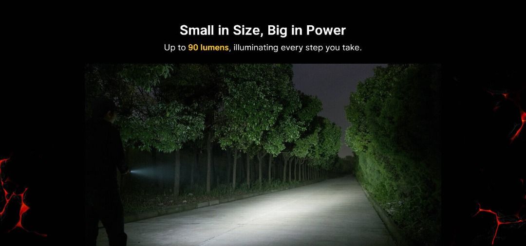 ✔ No. of mode, brightness & runtime : I. High : 90 lumens , 45 mins ✔ Beam distance (max) : 44 meters ✔ Beam intensity (max) : 500 cd ✔ Battery use : 1 x AAA alkaline battery ✔ Weight : 19.4 grams only ✔ Measurement (mm) : 14 x 60.5 ✔ Impact resistance : 1.5 meters ✔ Waterproof rating : IPX8 |