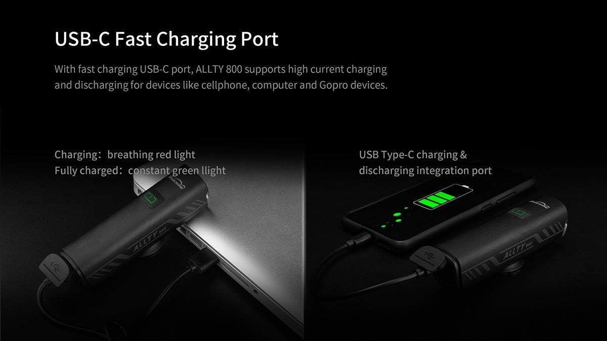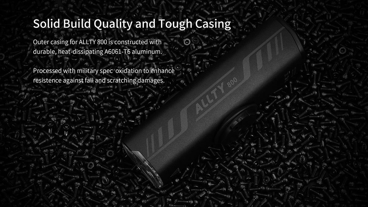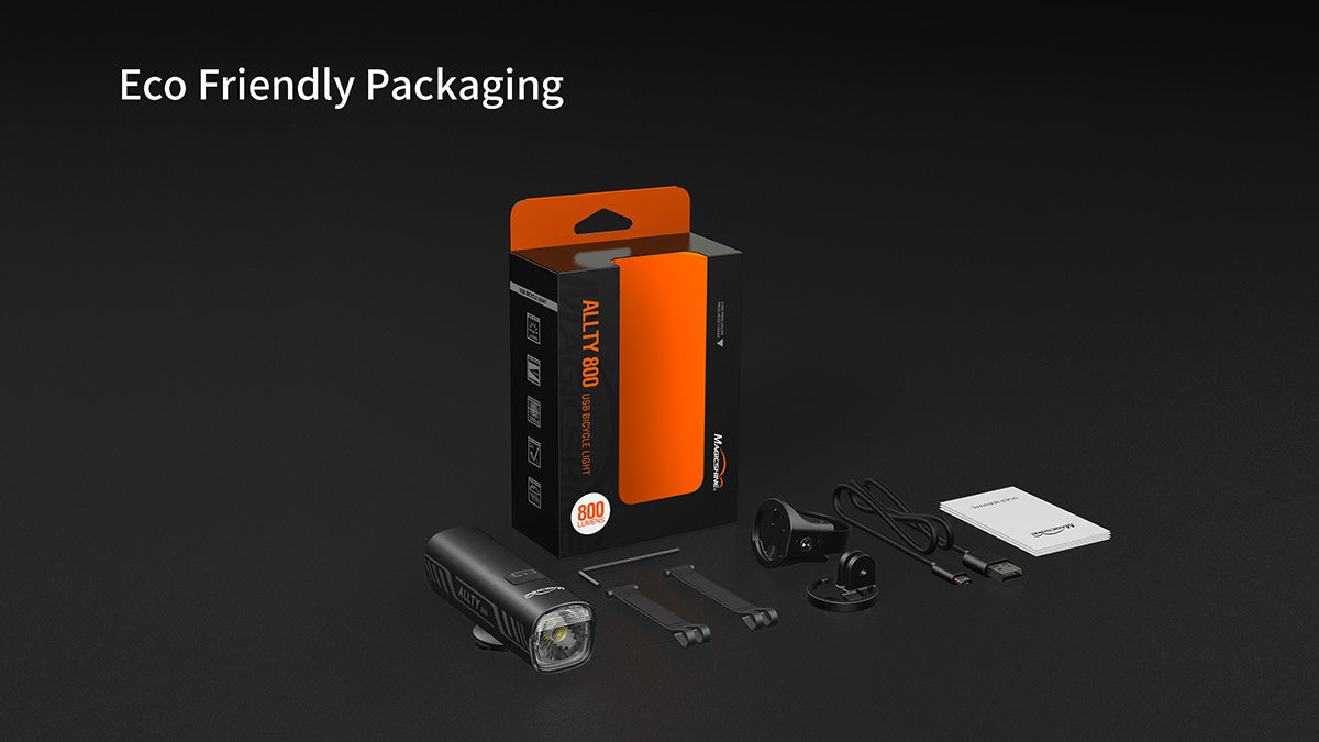 PACKAGE INCLUDE : 1 x Magicshine Allty 800 bicycle front light 1 x Handlebar mount 1 x Gopro mount 3 x Rubber strap 1 x Type-C USB cable 1 x Allen key 1 x User manual |