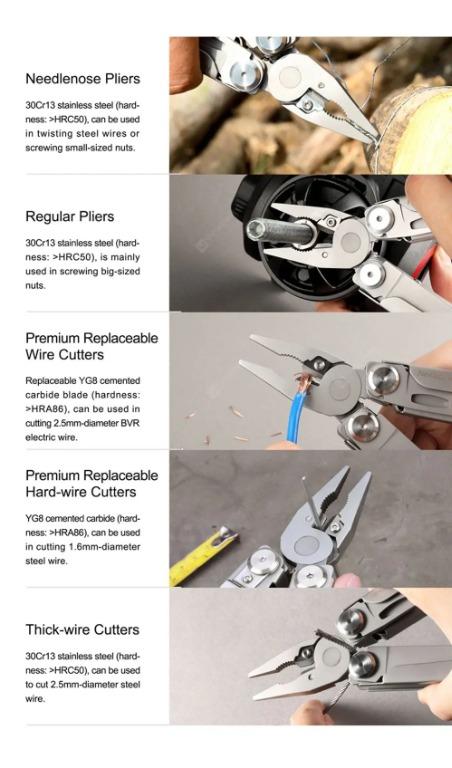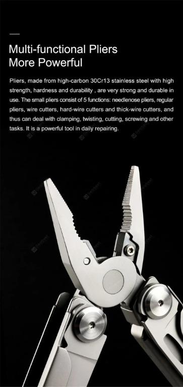 ✔ Materials: i. Main Body: 30Cr13 - Stainless Steel ii. Pliers Head: 30Cr13 - Stainless Steel iii. Blade: 50Cr15Mov - Stainless Steel iv. Pliers Head Cutting Edge: K30 (YG8) Hard Alloy ✔ Closed Length: 4.33" (11cm) ✔ Overall Length: 6.53" (16.6cm) ✔ Lock Type: Frame Lock ✔ Dimensions (L x W x H): 4.33" x 1.57" x 0.84" ✔ Weight: 8.67oz |