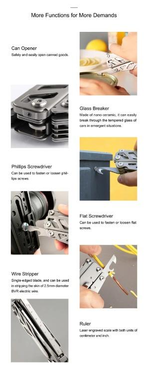 ✅ 16 different tools embedded into a double butterfly design; ✅ Compact and lightweight, perfect for daily carry to get your tasks done; ✅ A pair of big scissors with 30mm long cutting blade equals unparalleled practicality; ✅ Attached pocket clip allows for a multitude of different carry options; ✅ A high-hardness Nano-ceramic bead as efficient tempered-glass breaker; ✅ Combining a total of 5 regular pliers to satisfy various daily needs; ✅ A wood saw with two-sided cross sawtooth for double the cutting capacity; ✅ A unique hook-design line cutter and box opener for safe opening without damaging products inside; ✅ Includded tools : 1. Needlenose Pliers 2. Premium Replaceable Hard-wire Cutters 3. Regular Pliers 4. Premium Replaceable Wire Cutters 5. Thick-wire Cutters 6. Saw 7. Knife 8. Ruler 9. Glass Breaker 10. Scissors 11. Bottle Opener 12. Line Cutter 13. Phillips Screwdriver 14. Can Opener 15. Wire Stripper 16. Flat Screwdriver |