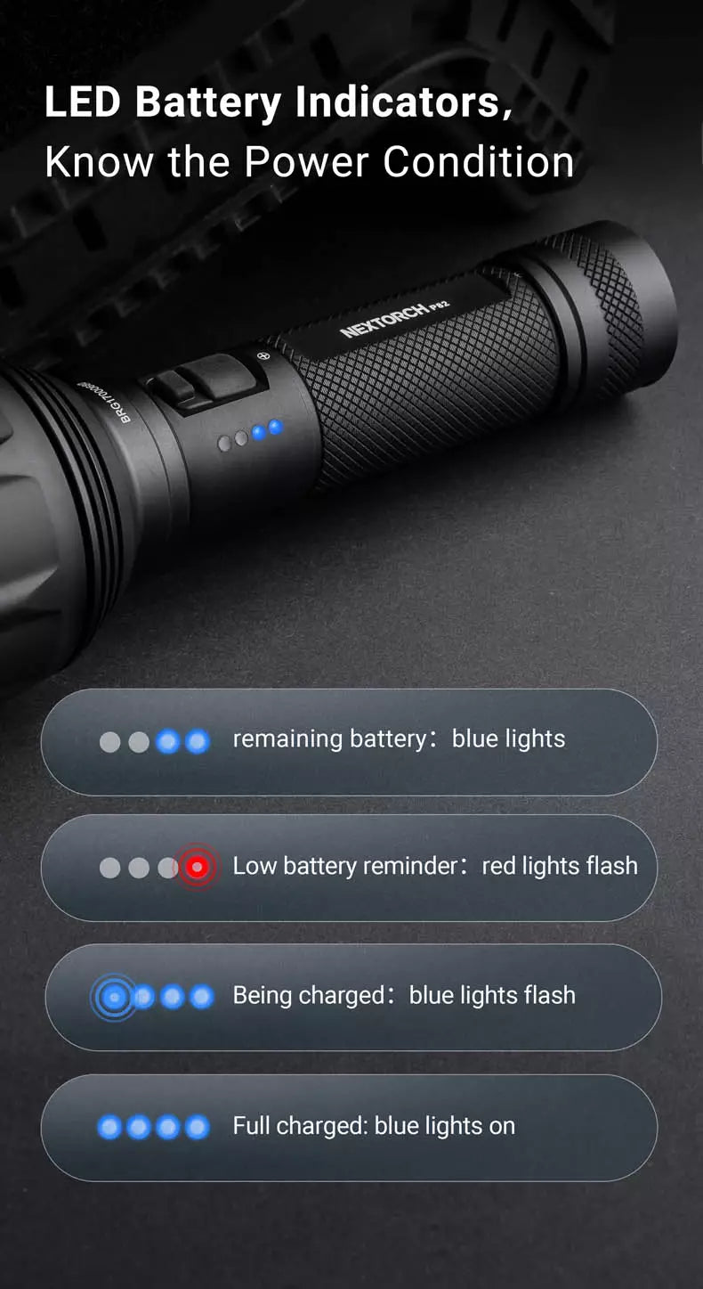 1 x Nextorch P82 Flashlight 1 x Nextorch 21700 rechargeable battery 1 x USB-C charging cable 1 x Lanyard 2 x Spare o-ring 1 x User manual |