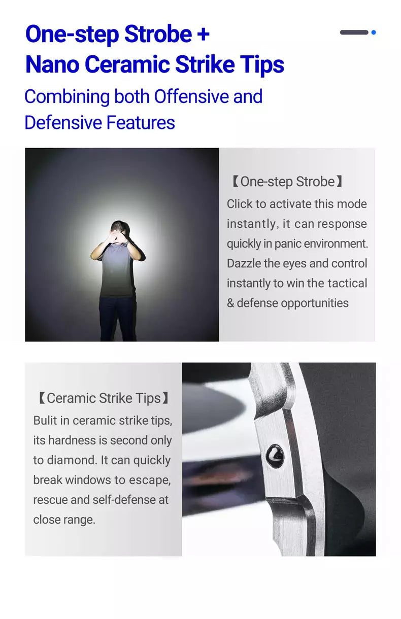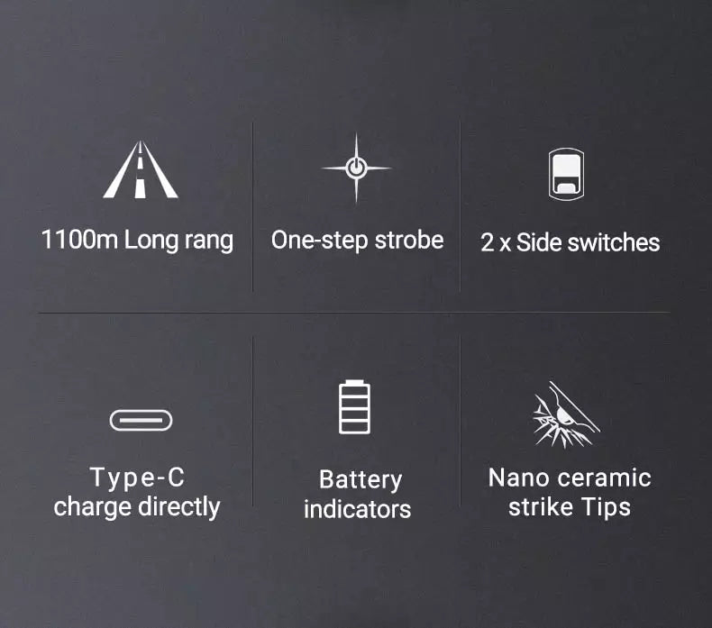 ✅ 1,100 meters long beam distance at its max output of 1,200 lumens; ✅ Dual side switches design for quick access to preferred mode; ✅ One step strobe & turbo design ideal for duty use and self-protection purpose; ✅ Strike bezel embedded with high hardness nano-ceramic beads, easy to break glass in emergency; ✅ Type-C USB charging port for speedy recharge the battery; ✅ Powered by popular 21700 high capacity battery; ✅ Easy to read battery level indicator to inform user the remaining battery level & charging status; ✅ Waterproof and shockproof. |
