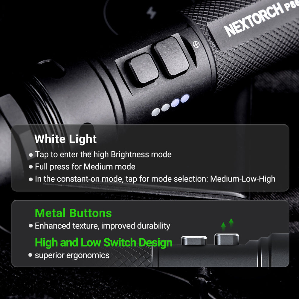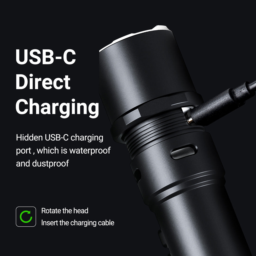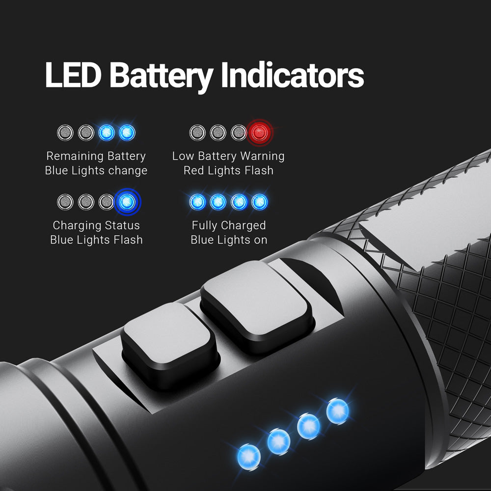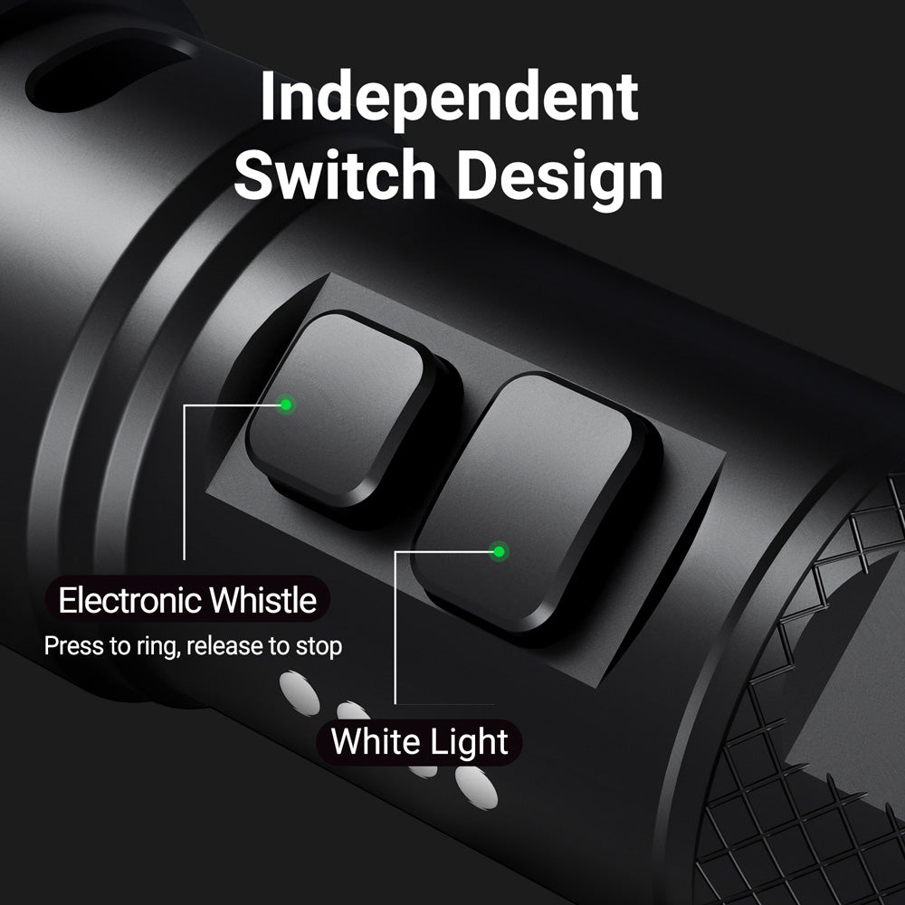 ✅ Integrated 120 dB electronic whistle for signaling purpose;✅ 1,600 lumens max brightness illuminate up to 305 meters;✅ Dual side switches independently control electronic whistle & flashlight;✅ Strong magnet on tail cap for attaching on metal surface;✅ Strike bezel embedded with high hardness Nano-ceramic beads for glass breaking in emergency;✅ Hidden Type-C USB charging port for speedy recharge the battery;✅ Easy to read battery level indicator to inform user the remaining battery level & charging status;✅ Made of durable & lightweight aluminum alloy;✅ Act as lantern with its tail stand capability;✅ Waterproof and shockproof;✅ Optional traffic wand & quick release holster is available. |