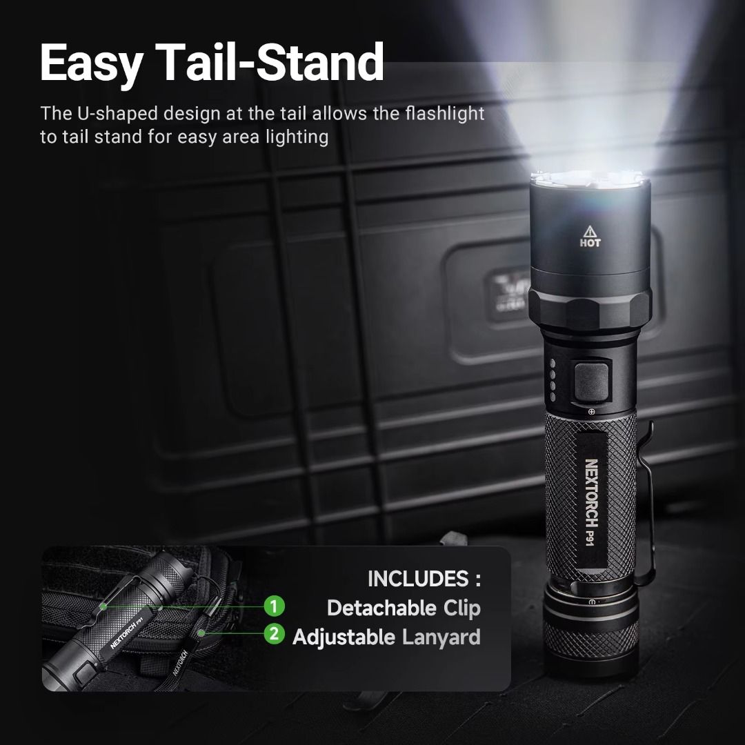 1 x Nextorch P91 flashlight1 x Nextorch 21700 li-ion rechargeable battery_4800 mAh1 x USB-C charging cable1 x Pocket clip1 x Wrist lanyard1 x User manual |