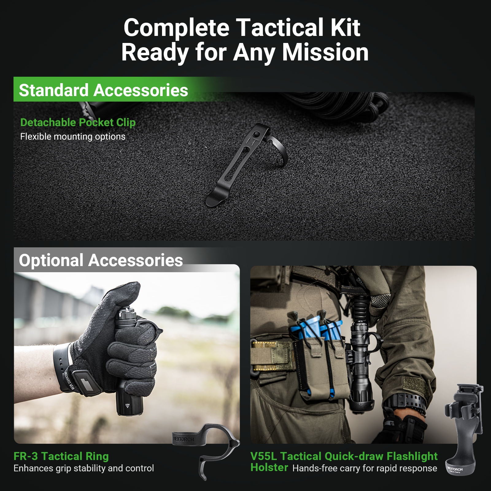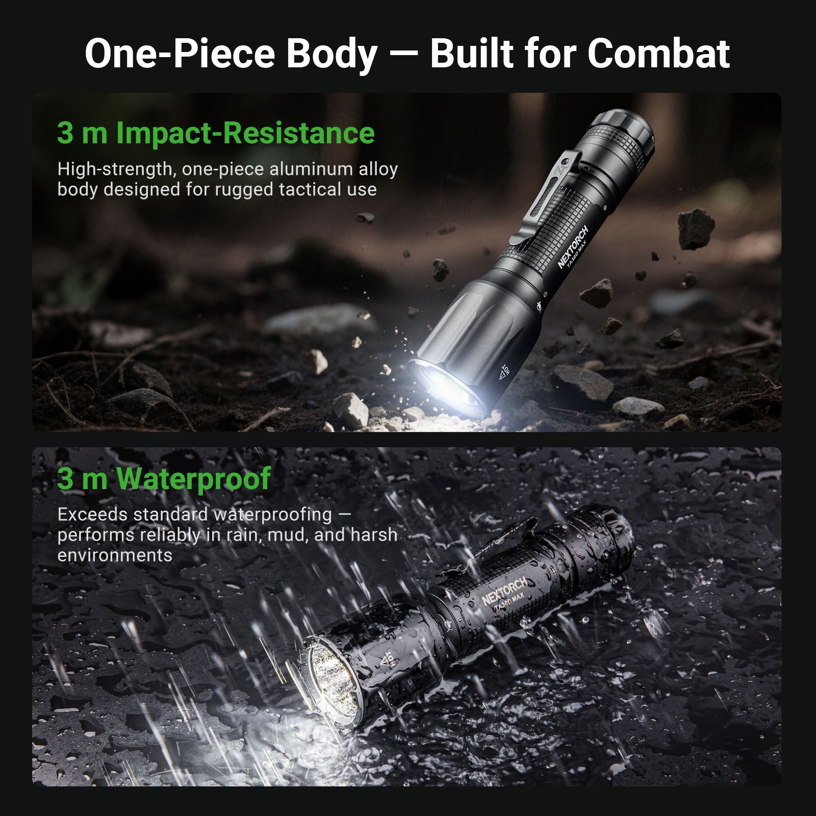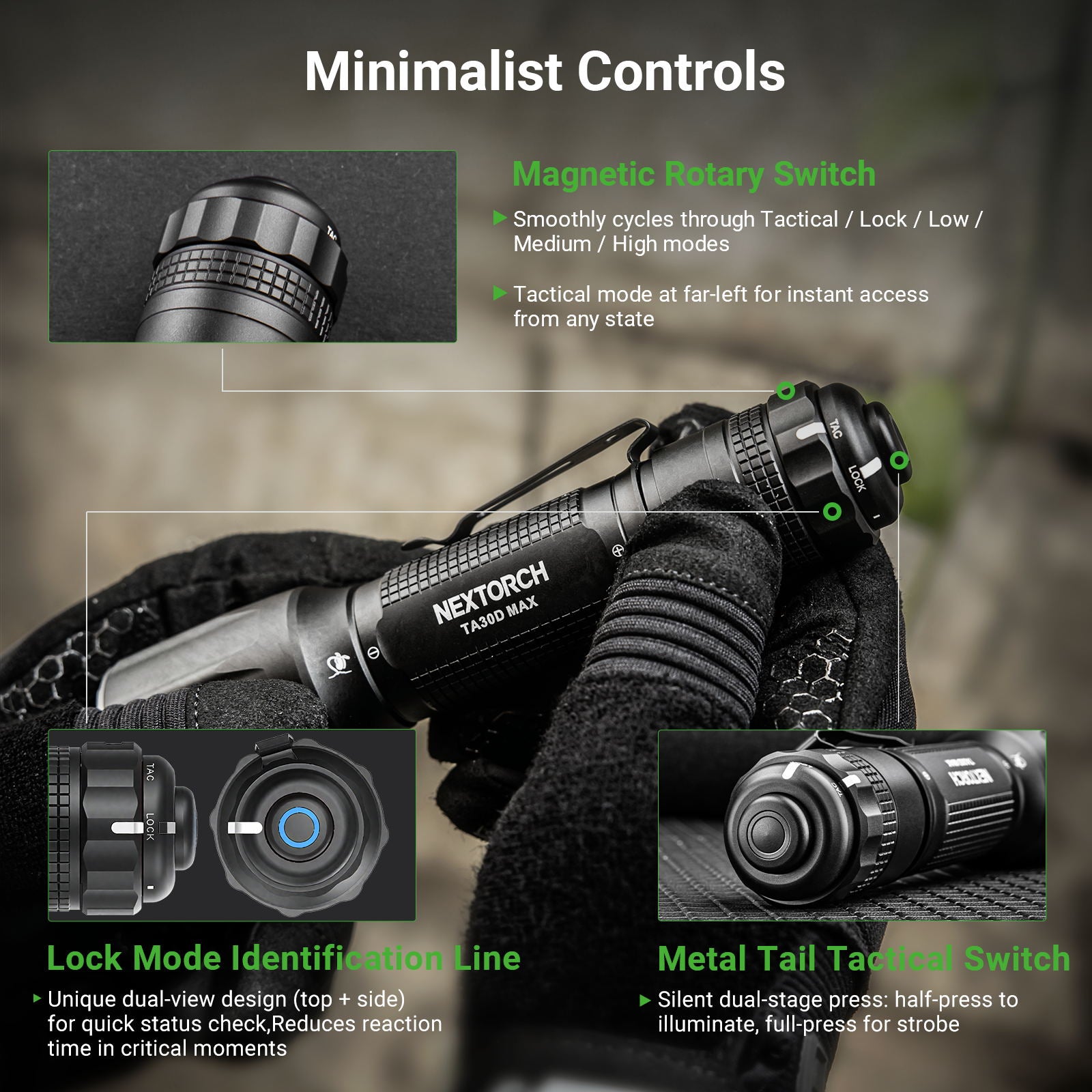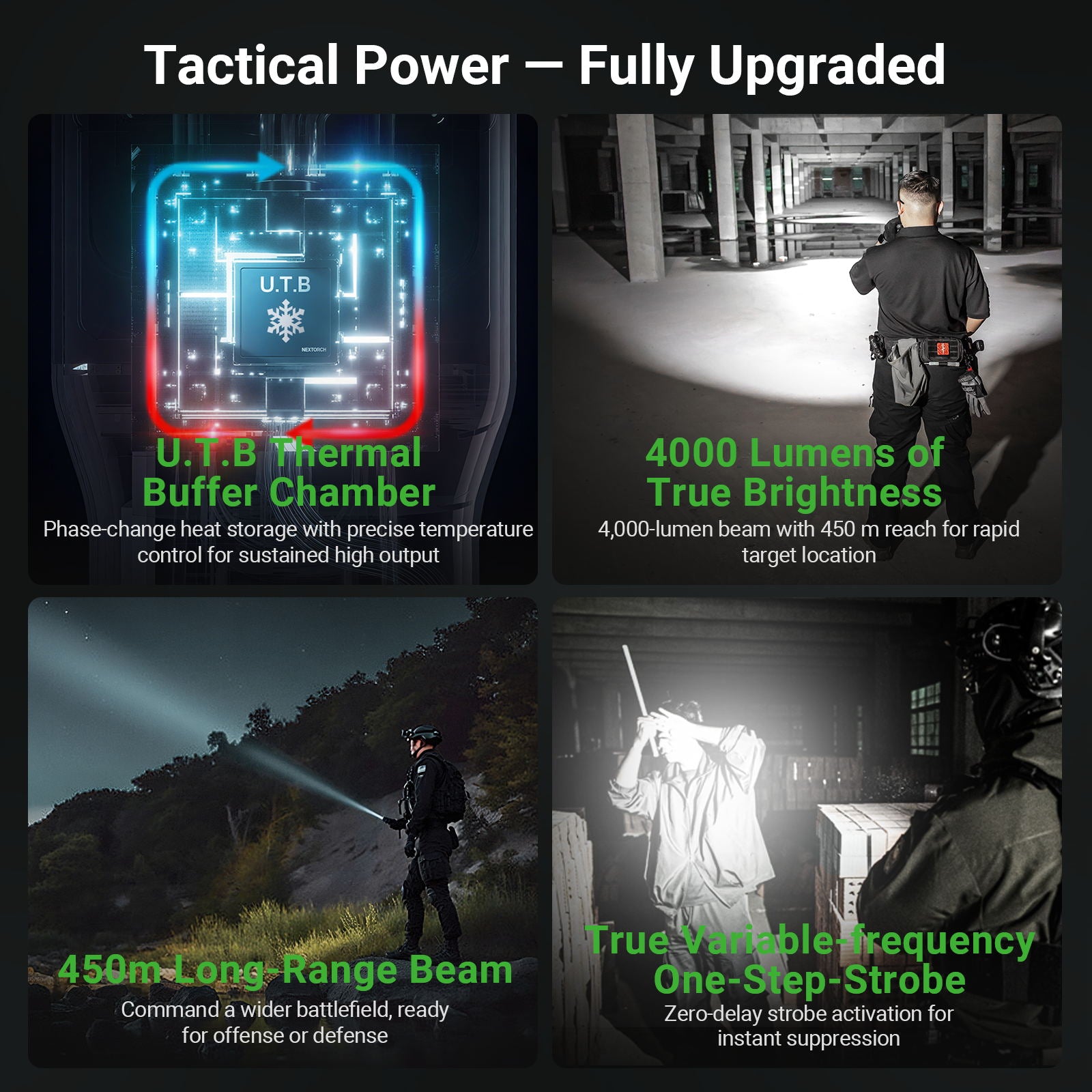 ✅ 4,000 lumens max output illuminate up to 450 meters; ✅ Nextorch U.T.B temperature control system that extend high mode runtime; ✅ Rotary magnetic switch around the tail cap for easy access to modes; ✅ Quick access to momentary turbo or strobe through its patented dual-function tactical tail switch; ✅ Included 21700 li-ion battery with built-in USB-C port for fast & convenient charging; ✅ Easy to read battery level on tail switch & the included battery; ✅ Strike bezel embedded with Nano-ceramic beads to efficiently break car windows; ✅ Multiple protections : battery reverse polarity, thermal regulation & battery over-discharge protection; ✅ Made of durable & lightweight aerospace aluminum; ✅ Waterproof & shockproof. |