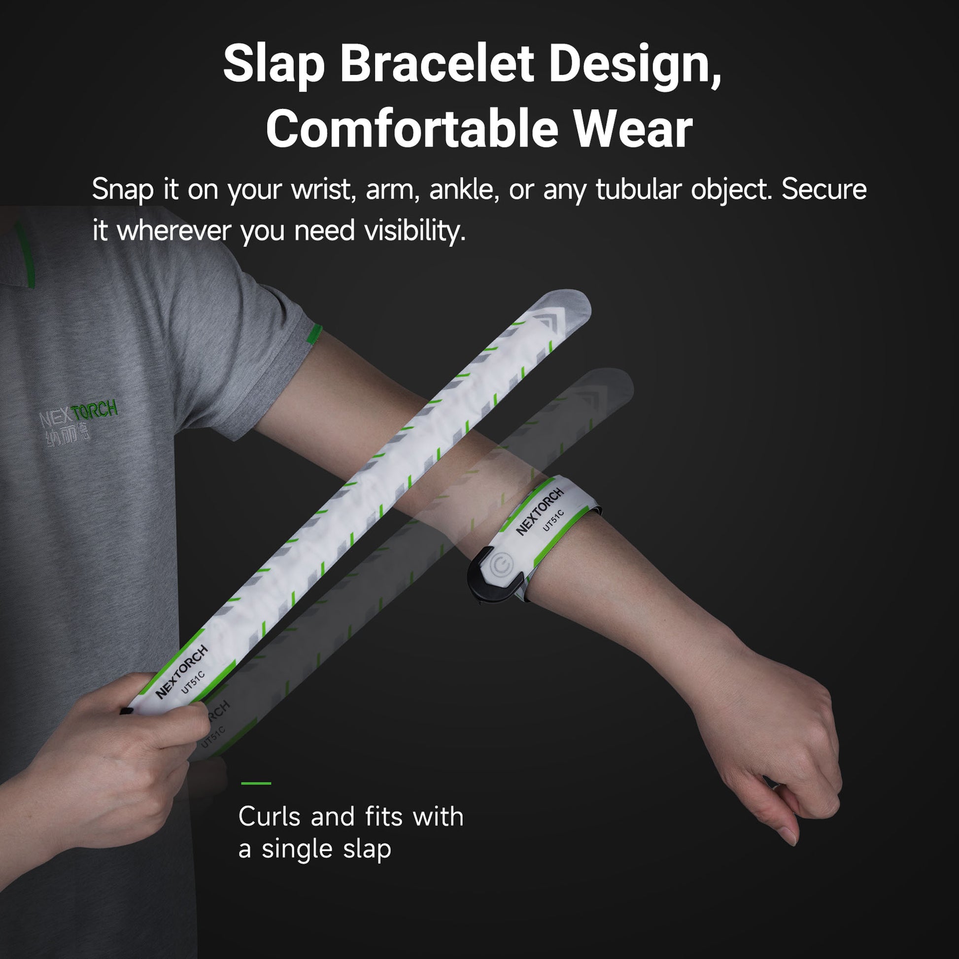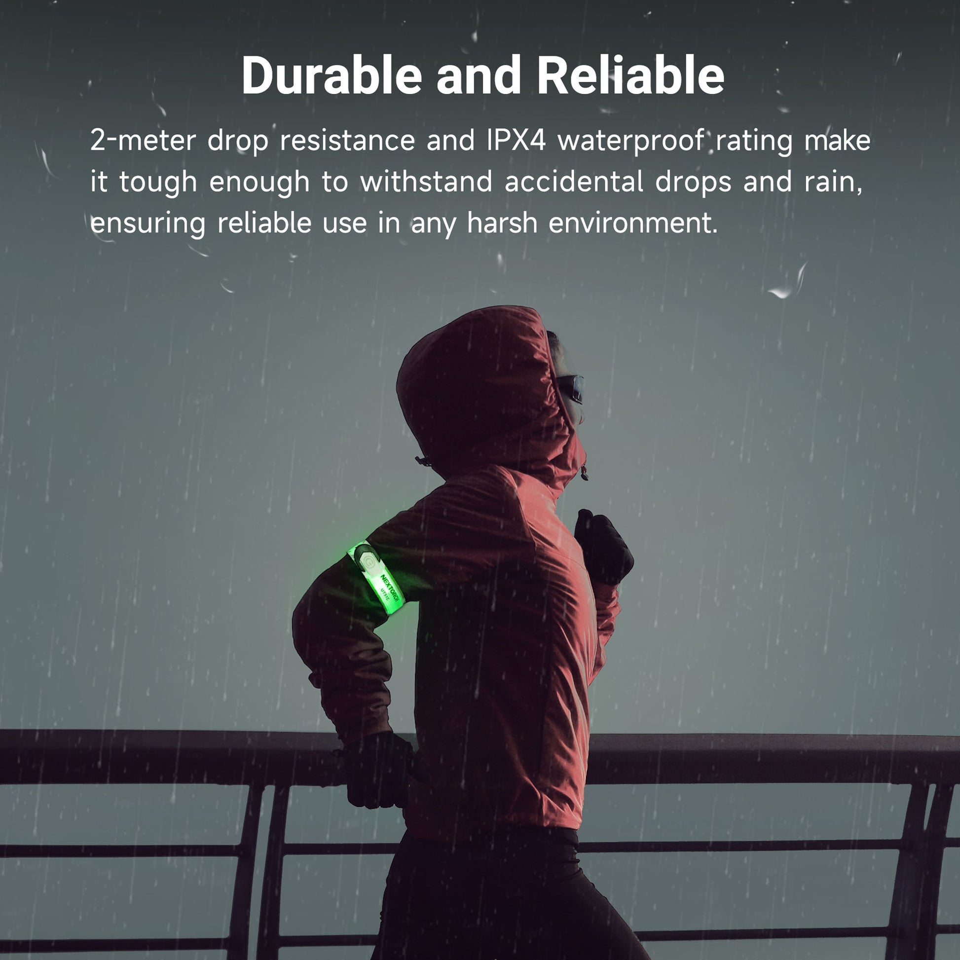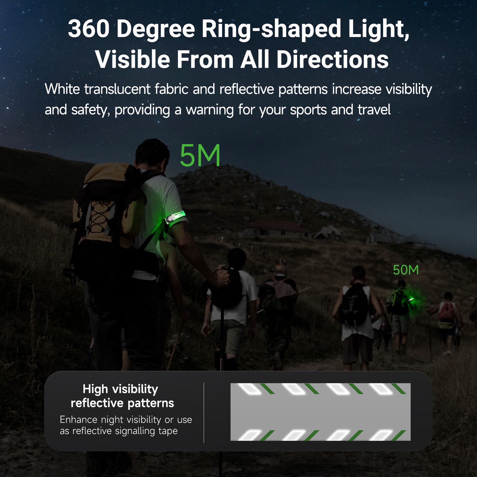 ✅ Slap and curl up on wrist, arm, ankle or other cylindrical objects to free your hands;✅ 3 colors (green, blue & orange colors) with 7 modes for various lighting needs;✅ 360° degree lighting provide all around protection during sport/work;✅ Passive reflective strap on the bracelet for enhanced visibility;✅ Long runtime of up to 3 hours in green light mode;✅ USB-C charging port for fast & convenient charging;✅ Easy to read battery level and charging indicator;✅ Extremely compact and lightweight - only 38 grams;✅ Waterproof & shockproof. |