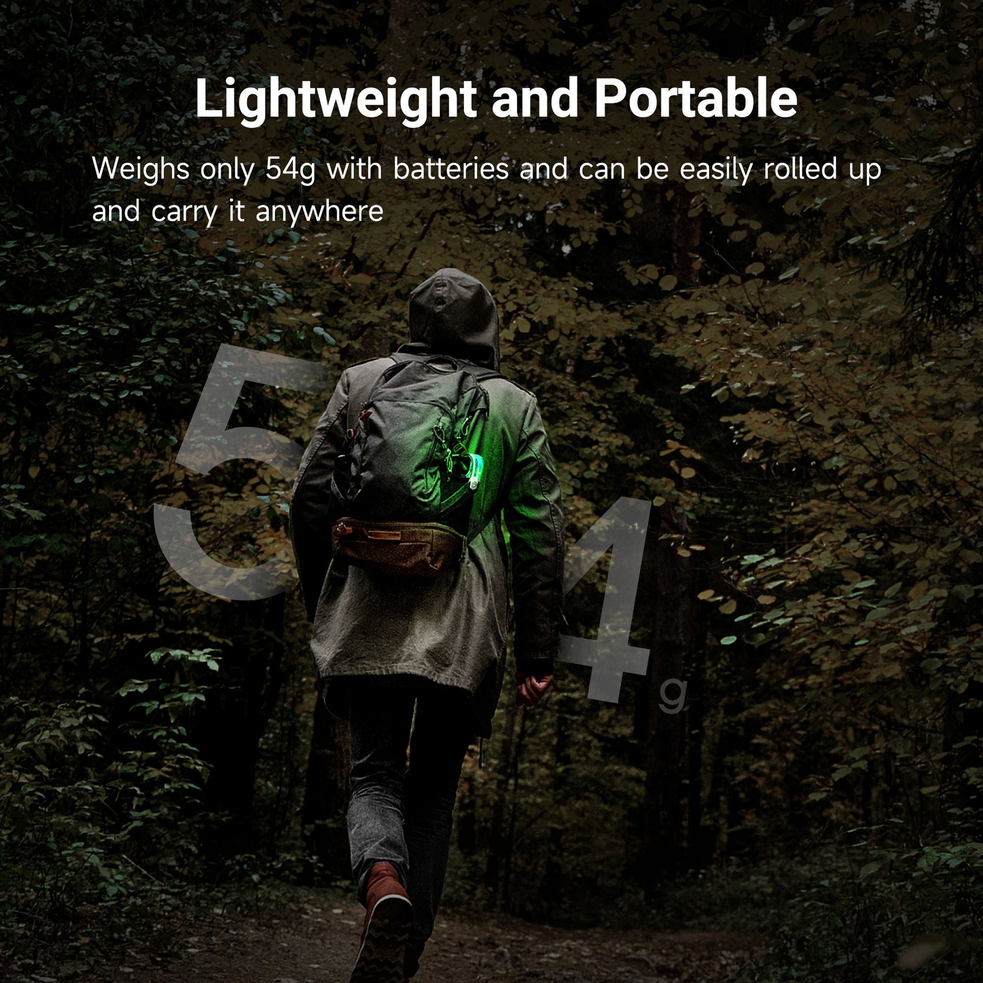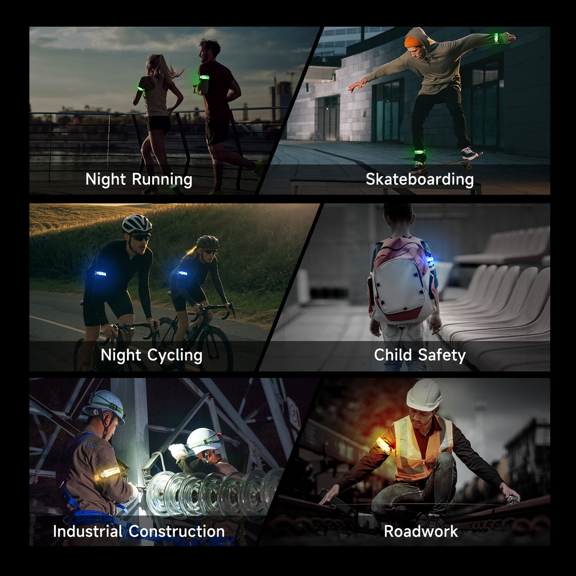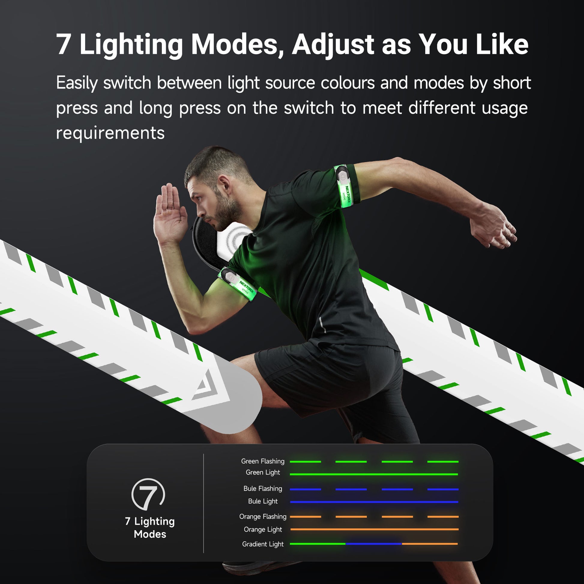 ✅ Slap and curl up on wrist, arm, ankle or other cylindrical objects to free your hands;✅ 3 colors (green, blue & orange colors) with 7 modes for various lighting needs;✅ 360° degree lighting provide all around protection during sport/work;✅ Passive reflective strap on the bracelet for enhanced visibility;✅ Long runtime of up to 3 hours in green light mode;✅ USB-C charging port for fast & convenient charging;✅ Easy to read battery level and charging indicator;✅ Extremely compact and lightweight - only 38 grams;✅ Waterproof & shockproof. |
