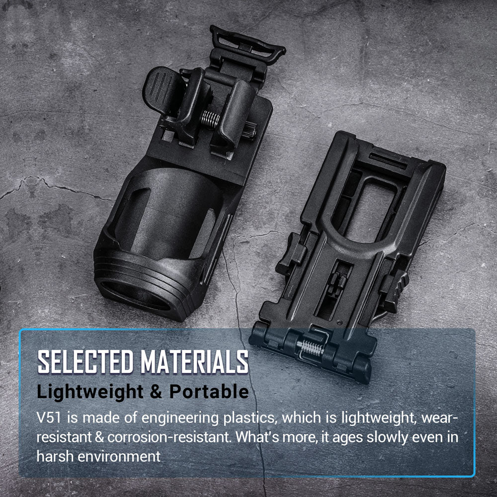 NEXTORCH V51 Tactical Quick-Draw Flashlight Holder is an upgrade from the classic V5, with an even better belt clamp.The belt clamp can be freely detached and is compatible with belts up to 55 mm wide and MOLLE. Same as V5, V51 is 360° rotatable with 16 locking positions.You can always find the right angle for your light. Besides holding and getting your flashlight at the right angle, V51 also allows you to draw your flashlight from it quickly or lock it tight.It is compatible with flashlights with a body diameter of 25 - 32 mm. |