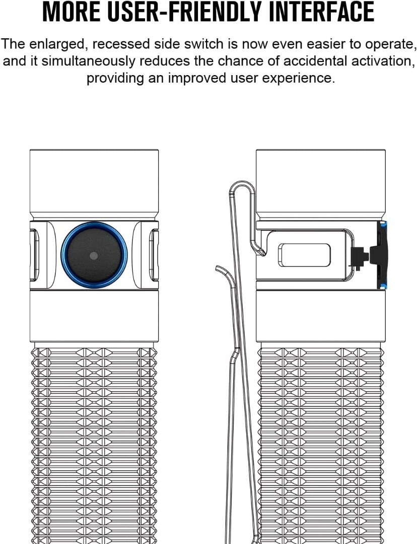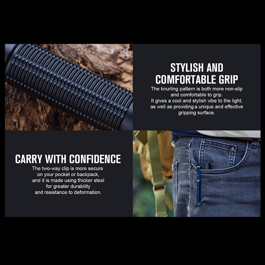 | FEATURES : ✅ 2,500 lumens max output illuminate up to 145 meters; ✅ Shake-to-awake tri-color battery level indicator on side switch; ✅ Proximity sensor automatically reducing the brightness when the sensor detects an obstruction nearby; ✅ Support hands-free operation with its magnetic tail-cap & dual directional pocket clip; ✅ 5 brightness levels & strobe to meet different lighting needs; ✅ Mode memory function for quick access to preferred mode; ✅ Lock-out feature to prevent accidental activation; ✅ Multiple safety protections - battery reverse polarity, battery overcharge, battery over-discharge & overheat protections; ✅ Made of durable & lightweight aluminum alloy; ✅ Waterproof & shockproof. |