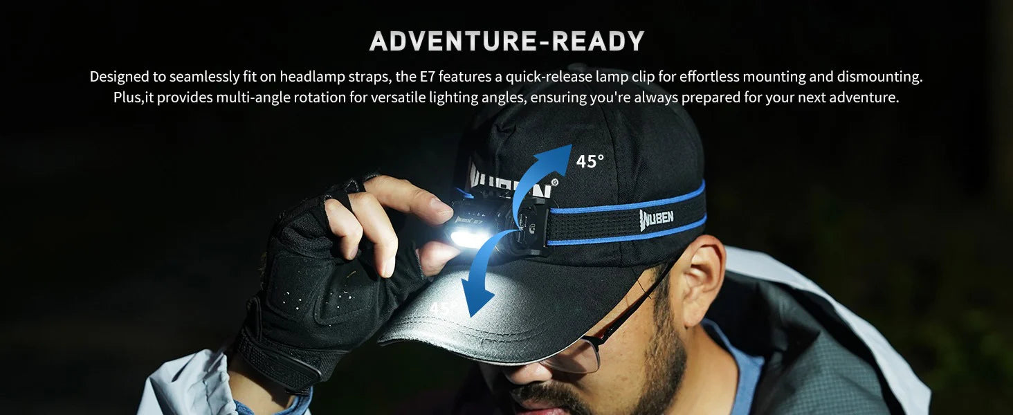 KEY FEATURES:✅ Impressive 1,800 lumens max output from a thumb size light;✅ Not just a headlamp, it serves as right angle flashlight after removing the headband✅ Convert 18350 into 18650 battery with the optional extension tube (tube sold separately @ $12.80);✅ Detachable hand gesture sensor for convenient mode switch (optional item sold @ $10);✅ Strong magnet on the tail for attaching E7 on metal surface;✅ Ultra compact & lightweight, weigh only 80 grams;✅ USB-C charging port on body for fast & convenient charging;✅ Mode memory function for quick access to last used mode;✅ Instant access to turbo & strobe mode;✅ LED battery level and charging indicator;✅ Multiple safety protections : battery reverse polarity, overheat management, battery overcharge & battery over-discharge protections;✅ Made of premium quality aluminum;✅ Waterproof & shockproof. |