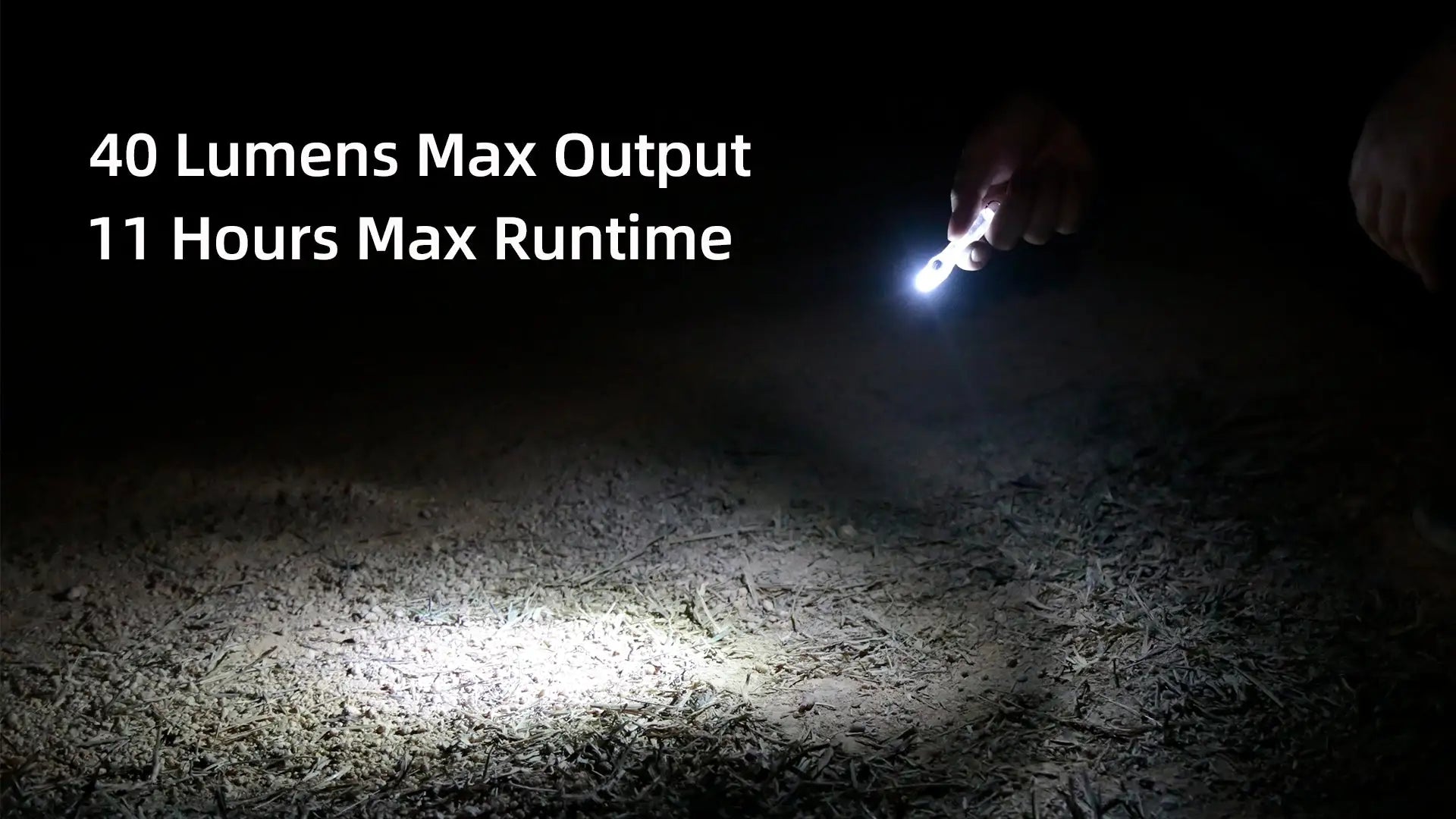 SPECIFICATIONS : ✔ No. of mode, brightness & runtime :I. High : 40 lumens I 1 hour 30 minsII. Low : 1 Lumen I 11 hrs✔ Beam distance (max) : 15 meters✔ Beam intensity (max) : 55 candela✔ Battery use : Built-in 120 mAh battery pack✔ Impact resistant : 1 meter✔ Weight : 8 grams✔ Measurement : 68 x 15 x 12 mm |