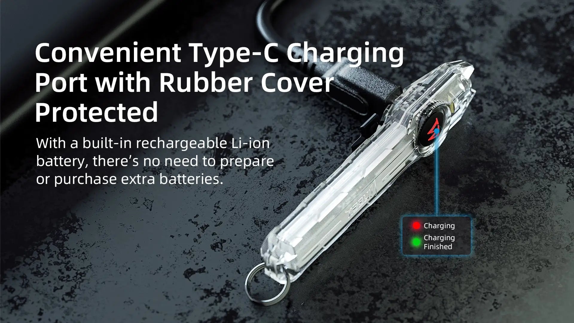 KEY FEATURES:✅ Unique & stylish transparent body that glow with the light (for white & blue only);✅ Ultra compact & lightweight key size design for convenient carry - only 8 grams;✅ Fully charge in 30 minutes with its USB-C fast charging port;✅ Easy to read battery level indicator;✅ Mode memory function for easy access to preferred mode;✅ Simple & straightforward user interface for accessing the modes;✅ Waterproof & shockproof. |