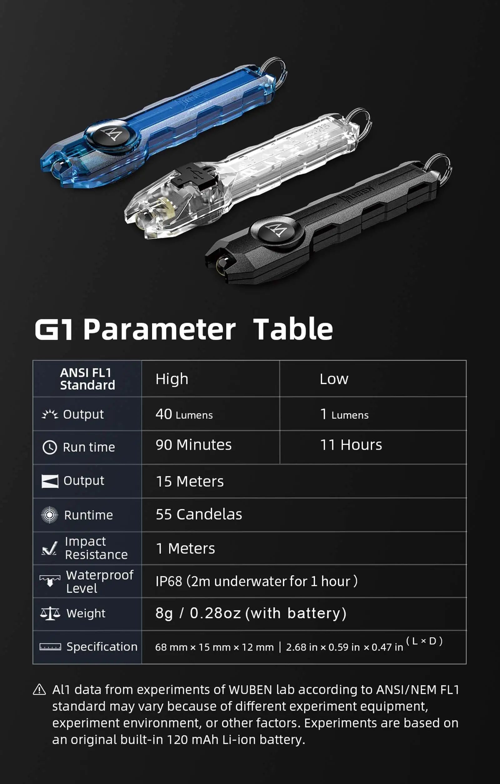 PACKAGE INCLUDE: 1 x Wuben G1 keychain flashlight1 x USB-C charging cable1 x Keyring1 x Use manual |