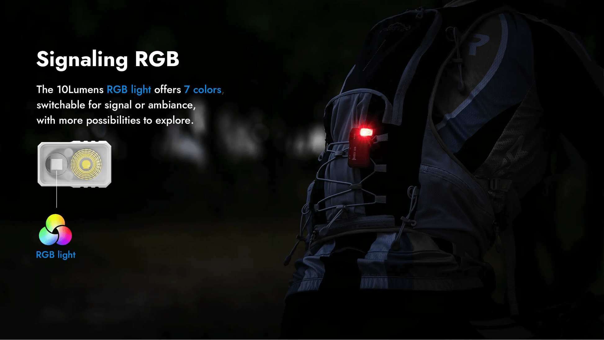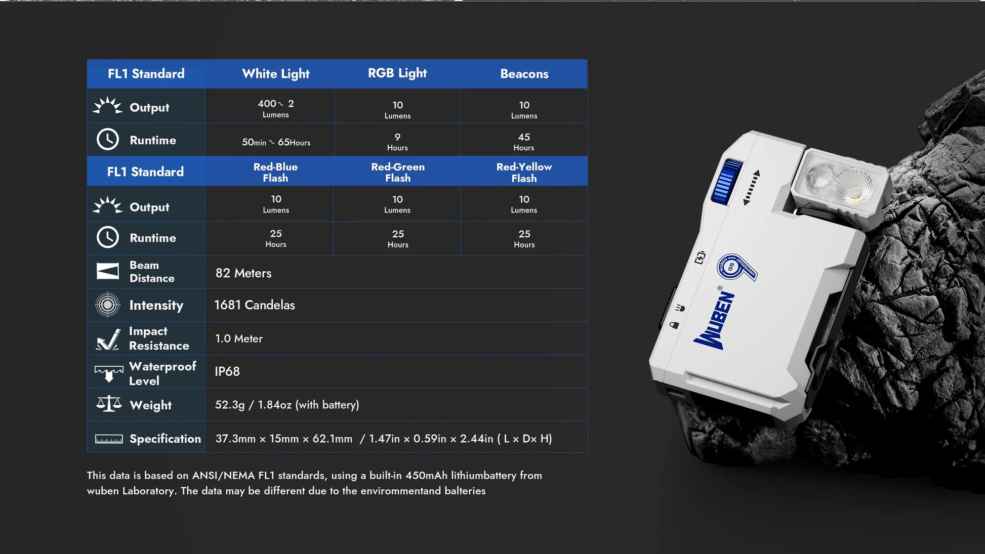 ✔ Mode, runtime & brightness :I. Constant-on :1. White light (step-less dimming) : 5 to 400 lumens I 50 mins to 65 hrs2. RGB light (7 colors) : 10 lumens I 9 hrsII. Flashing :1. Red & blue : 10 lumens I 25 hrs2. Red & yellow : 10 lumens I 25 hrs3. Red & green : 10 lumens I 25 hrsIII. Beacon (RGB 7 colors) : 10 lumens I 45 hrs✔ Beam distance (max) : 82 meters✔ Battery use : Built-in battery✔ Waterproof rating : IP68✔ Impact resistance : 1 meter✔ Dimension : 37.3 x 15 x 62.1 mm✔ Weight : 52.3 grams |