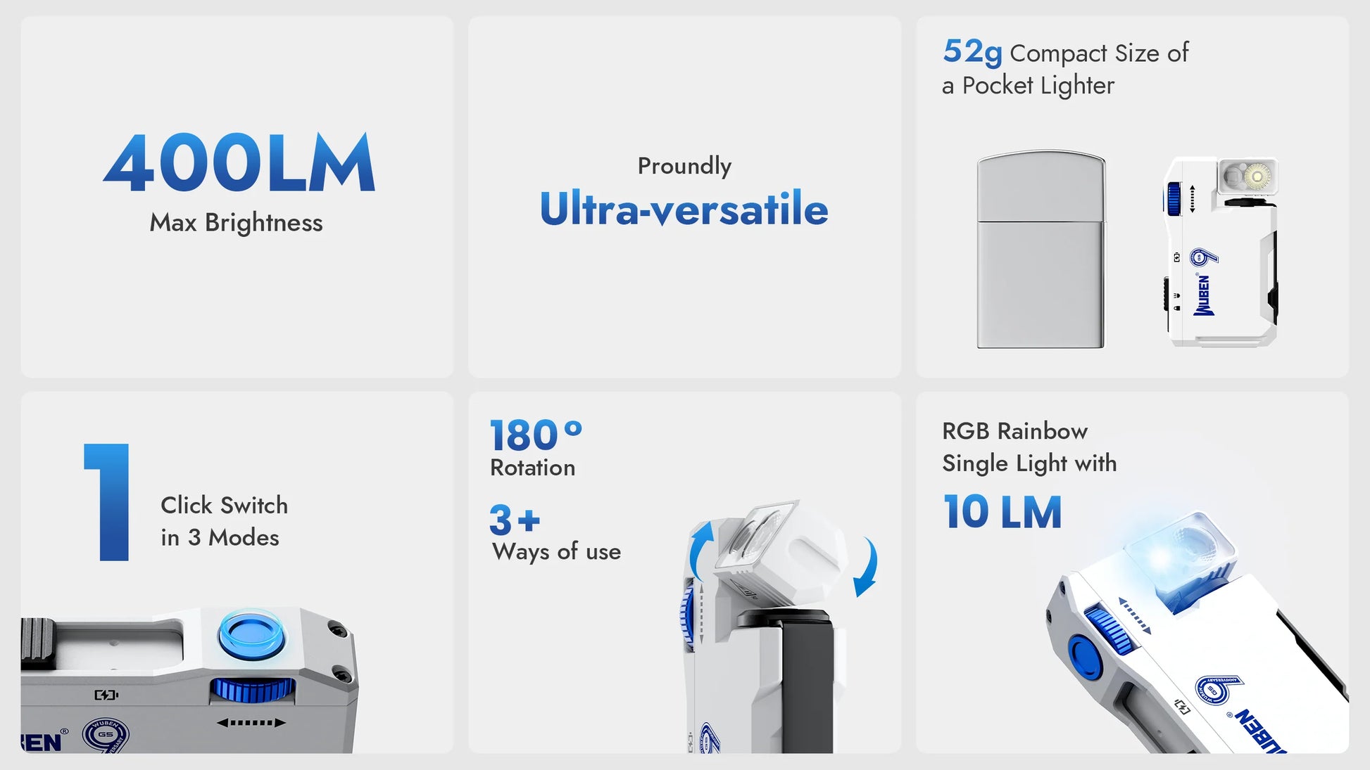 ✅ 400 lumens max output illuminate up to 82 meters;✅ 180° degree rotatable light head for ultimate coverage;✅ 7 colors auxiliary lights for signaling or ambiance purpose;✅ 3 types of flashing mode from the auxiliary lights to increase your visibility;✅ Pocket clip with 180° degree adjustable pocket clip for more flexibility;✅ Magnetic base for attaching G5 to metal surface while carry out duty;✅ Support continuous usage while charging;✅ Hidden USB-C charging port with convenient charging & better protection;✅ Convenient lock-out switch for quick lock & unlock the light;✅ High strength & lightweight aluminum body;✅ Multiple safety protections : battery overcharge, battery over-discharge, battery reverse polarity & overheat;✅ Waterproof & shockproof. |