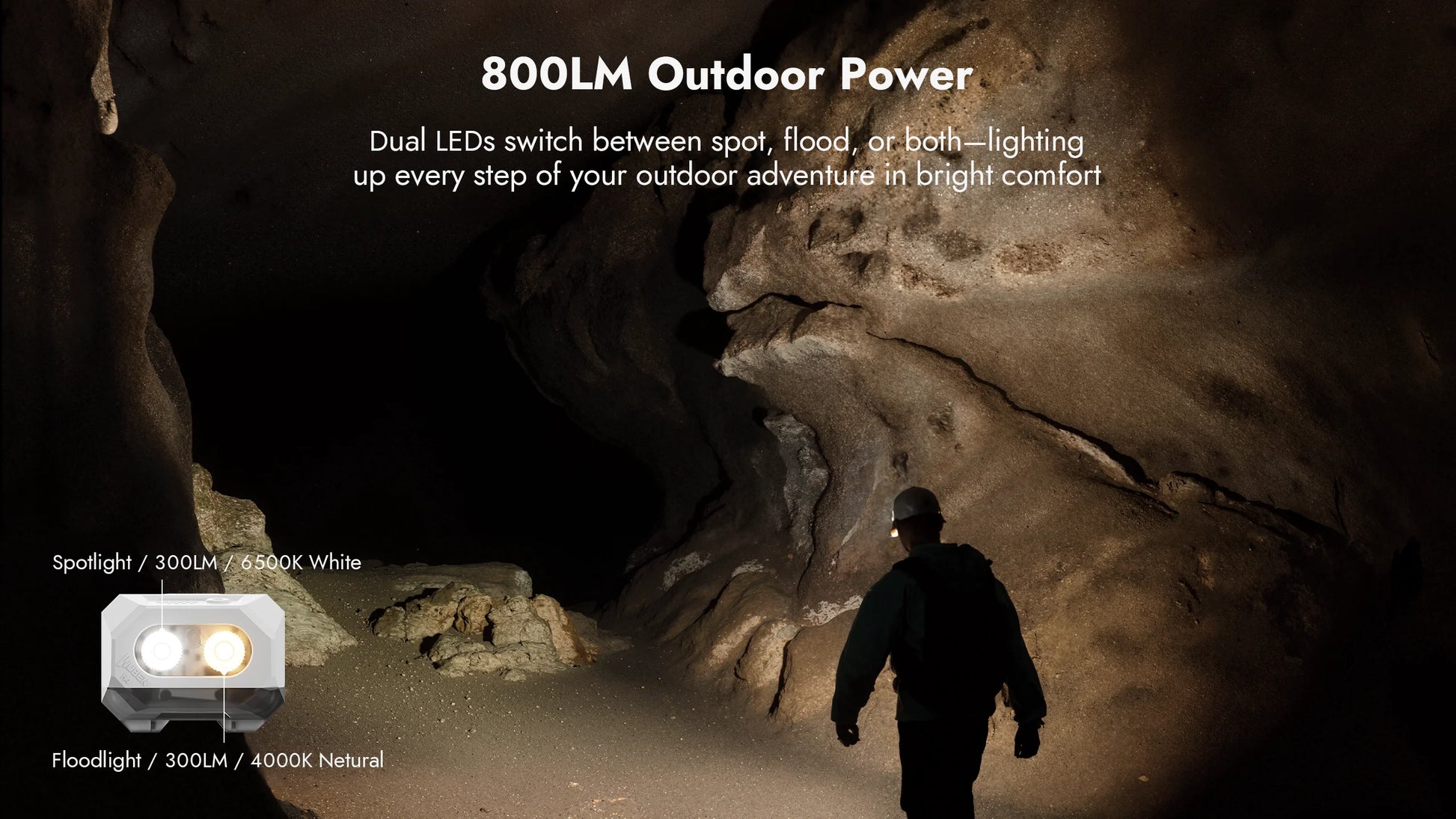 KEY FEATURES: ✅ 800 lumens max output shine up to 66 meters; ✅ 3 light sources (white light, warm white light & red light) for diverse illumination needs; ✅ Flood & throw dual beam distance design for comprehensive coverage; ✅ Motion sensor for handwave on and off the headlamp; ✅ Mode memory function for quick access to last use mode; ✅ Compatible with 2 sources of battery, the included battery pack or 3X AAA battery; ✅ 90 degree tilt-able light head for effortless lighting everywhere; ✅ Ultra compact & lightweight - only 80 grams; ✅ USB-C charging port on battery for fast & convenient charging; ✅ Easy to read battery level & charging indicator; ✅ IP68 waterproof protection and passed 1.2 meters drop test. |