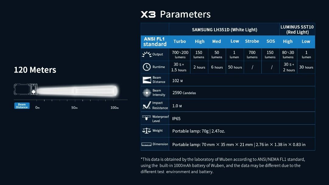 ✔ LED : 1 x White LED, 1 x Red LED✔ No. of mode, brightness & runtime :A. White light :I. Turbo : 700 ➤ 200 lumens I 30s + 1.5 hrsII. High : 150 lumens I 2 hrsIII. Mid : 50 lumens I 6 hrsIV. Low : 1 lumen I 50 hrsV. Strobe : 700 lumens I -VI. SOS : 150 lumens I -B. Red light :I. High : 80 ➤ 30 lumens I 30s + 2 hrsII. Low : 1 lumen I 30 hrs✔ Beam distance (max) : 102 meters✔ Beam intensity (max) : 2590 cd✔ Battery :I. Flashlight : 1,000 mAhII. Charging box : 3,000 mAh✔ Impact resistance : 1 meter✔ Waterproof rating : IP65✔ Weight : 70 grams (light)✔ Measurement : 70 x 35 x 21 mm |
