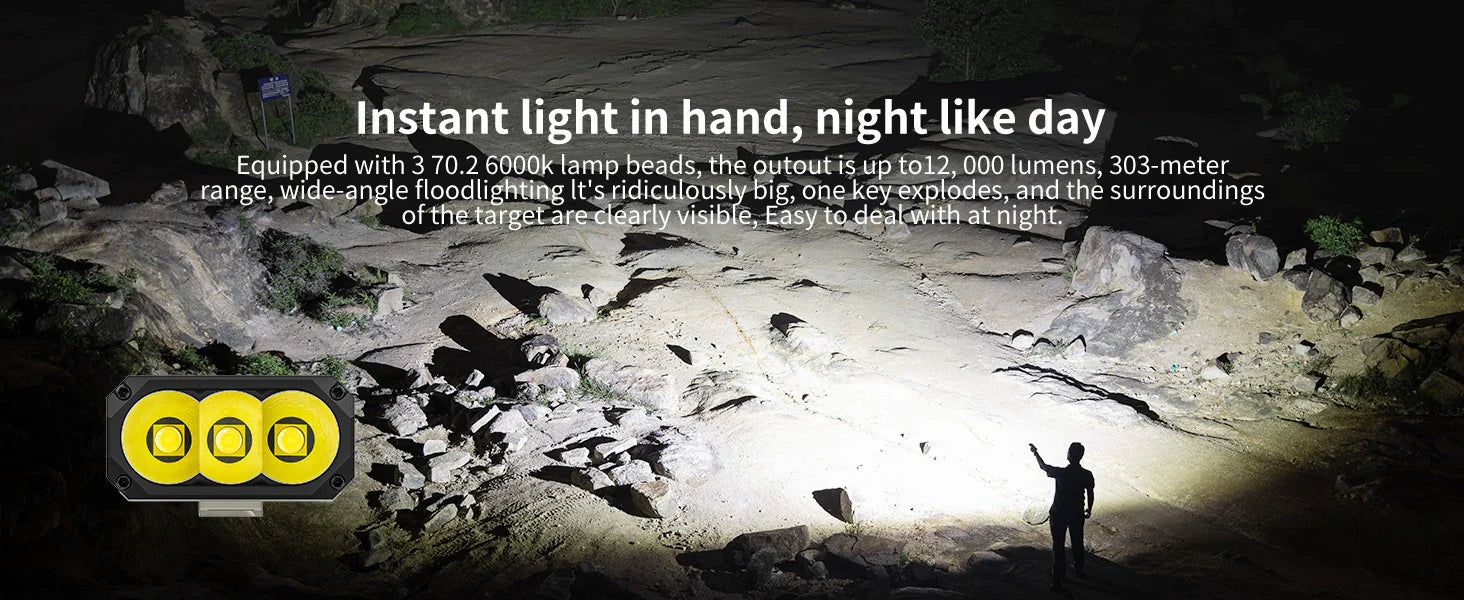 KEY FEATURES: ✅ 12,000 lumens max output illuminate up to 303 meters; ✅ Intelligent cooling fan for faster heat dissipation; ✅ Impressive constant 3,000 lumens for up to 1.7 hours; ✅ Adopt PD27W Type-C charging port that full charge the battery in just 2 hours; ✅ 10,000 mAh battery capacity with 2 pieces of 21700 li-ion battery (self-replaceable); ✅ Unique rectangular shape design for easy carry in pocket; ✅ 7 lighting modes for different environment lighting needs; ✅ Lock-out mode available to prevent accidental activation; ✅ Mode memory function for quick access to preferred mode; ✅ Stainless steel side buttons on handle for easy accessing to all outputs; ✅ Multiple protection systems - overheat, battery overcharge, & battery over-discharge; ✅ Made of durable & lightweight aluminum alloy; ✅ Waterproof & shockproof. |