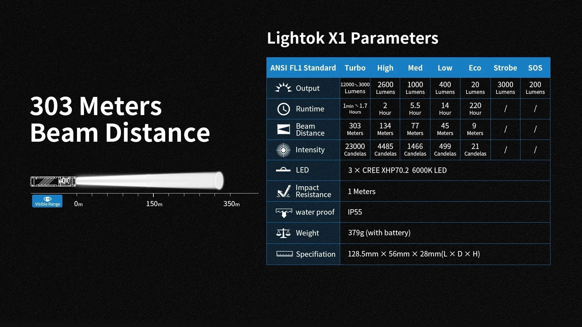 SPECIFICATIONS : ✔ LED : 3 x High performance cool white LED ✔ Mode, brightness & runtime : I. Turbo : 12,000 ➤ 3,000 lumens I 1 mins ➤ 1.7 hrs II. High : 2,600 lumens I 2 hrs III. Mid : 1,000 lumens I 5.5 hrs V. Low : 400 lumens I 14 hrs VI. Eco : 20 lumens I 220 hrs VII. Strobe : 3,000 lumens I - IV. SOS : 200 lumens I - ✔ Beam distance (max) : 303 meters ✔ Beam intensity (max) : 23,000 cd ✔ Battery use : 2 x 21700 li-ion battery ✔ Weight : 379 grams with battery ✔ Dimension : 128.5 x 56 x 28 mm ✔ Waterproof rating : IP55 ✔ Impact resistance : 1 meter |